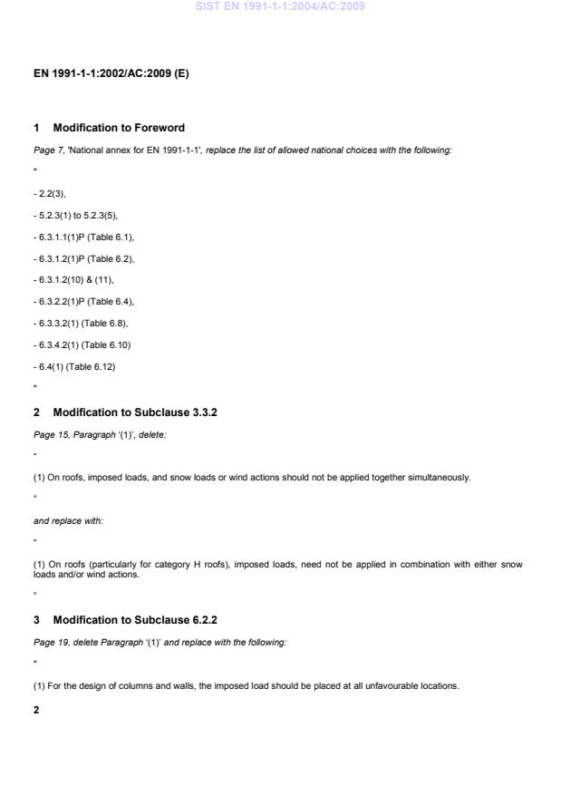 Page 15, Paragraph ‘(1)’, delete: “ (1) On roofs, imposed loads, and snow loads or wind actions should not be applied together simultaneously. ” and replace with: “ (1) On roofs (particularly for category H roofs), imposed loads, need not be applied in combination with either snow loads and/or wind actions. ” 3 Modification to Subclause 6.2.2 Page 19, delete Paragraph ‘(1)’ and replace with the following: " (1) For the design of columns and walls, the imposed load should be placed at all unfavourable locations. SIST EN 1991-1-1:2004/AC:2009