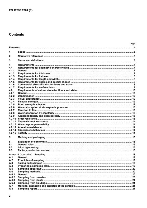 1 Scope This document specifies requirements for flat natural stone slabs fabricated for use as floor and stair coverings. It does not cover mineral aggregates and artificial agglomerated stone material and does not cover installation. 2 Normative references The following referenced documents are indispensable for the application of this document. For dated references, only the edition cited applies. For undated references, the latest edition of the referenced document (including any amendments) applies. EN 1925, Natural stone test methods - Determination of water absorption coefficient by capillarity. EN 1936, Natural stone test methods - Determination of real density and apparent density and of total and open porosity. EN 12371, Natural stone test methods - Determination of frost resistance. EN 12372, Natural stone test methods - Determination of flexural strength under concentrated load. EN 12407, Natural stone test methods - Petrographic examination. EN 12440, Natural stone - Denomination criteria. EN 12524, Building materials and products - Hygrothermal properties - Tabulated design values. EN 12670:2001, Natural stone - Terminology. EN 13161, Natural stone test methods - Determination of flexural strength under constant moment. EN 13373, Natural stone test methods - Determination of geometric characteristics on units. EN 13501-1, Fire classification of construction products and building elements - Part 1: Classification using test data from reaction to fire tests. EN 13755, Natural stone test methods - Determination of water absorption at atmospheric pressure. EN 14157, Natural stone test methods - Determination of the abrasion resistance. EN 14066, Natural stone test methods - Determination of resistance to ageing by thermal shock. EN 14231, Natural stone test methods - Determination of the slip resistance by means of the pendulum tester. EN ISO 12572, Hygrothermal performance of building materials and products - Determination of water vapour transmission properties (ISO 12572:2001). NOTE Besides the documents for test methods mentioned in this Clause, there exist further documents which can be used for scientific examinations, but which are not relevant for the application in practice according to this document.
