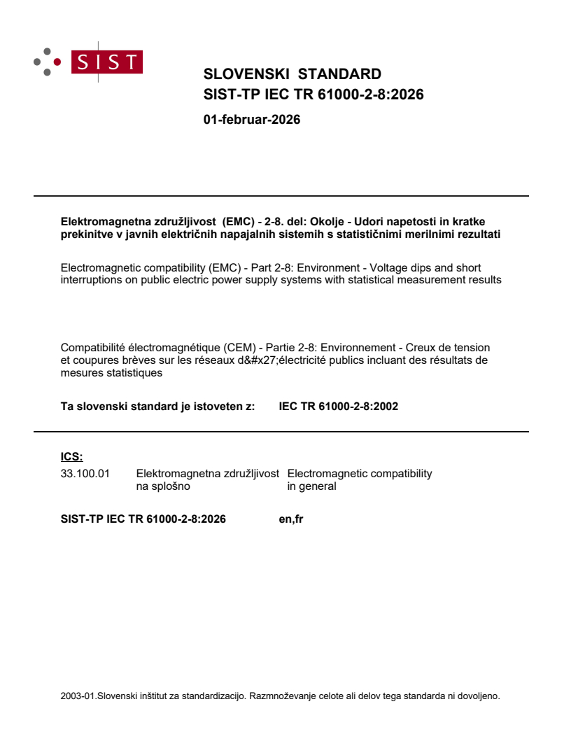 SIST-TP IEC TR 61000-2-8:2026 is a technical report published by the Slovenian Institute for Standardization (SIST). Its full title is "Electromagnetic compatibility (EMC) - Part 2-8: Environment - Voltage dips and short interruptions on public electric power supply systems with statistical measurement results". This standard covers: IEC TR 61000-2-8:2002, which is a technical report, describes the electromagnetic disturbance phenomena of voltage dips and short interruptions in terms of their sources, effects, remedial measures, methods of measurement, and measurement results (in so far as these are available). They are discussed primarily as phenomena observed on the networks of public electricity supply systems and having an effect on electrical equipment receiving its energy supply from those systems. “Voltage sag” is an alternative name for the phenomenon voltage dip.