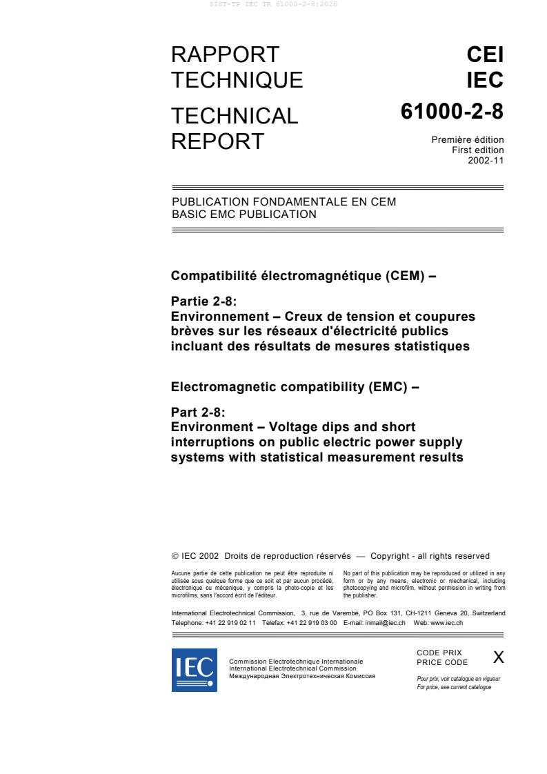 In summary, SIST-TP IEC TR 61000-2-8:2026 is a fundamental EMC publication offering valuable insights into voltage dips and short interruptions on public power systems. It equips professionals with practical knowledge and statistical evidence crucial for improving power system reliability and ensuring the proper operation of electrical equipment under transient power quality events.
