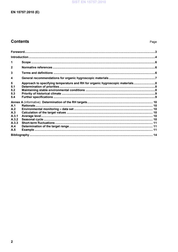 Determination of the RH targets . 10A.1 Rationale . 10A.2 Environmental monitoring – data set . 10A.3 Calculation of the target values . 10A.3.1 Average level . 10A.3.2 Seasonal cycle . 10A.3.3 Short-term fluctuations . 11A.4 Determination of the target range . 11A.5 Example . 11Bibliography . 14 SIST EN 15757:2010