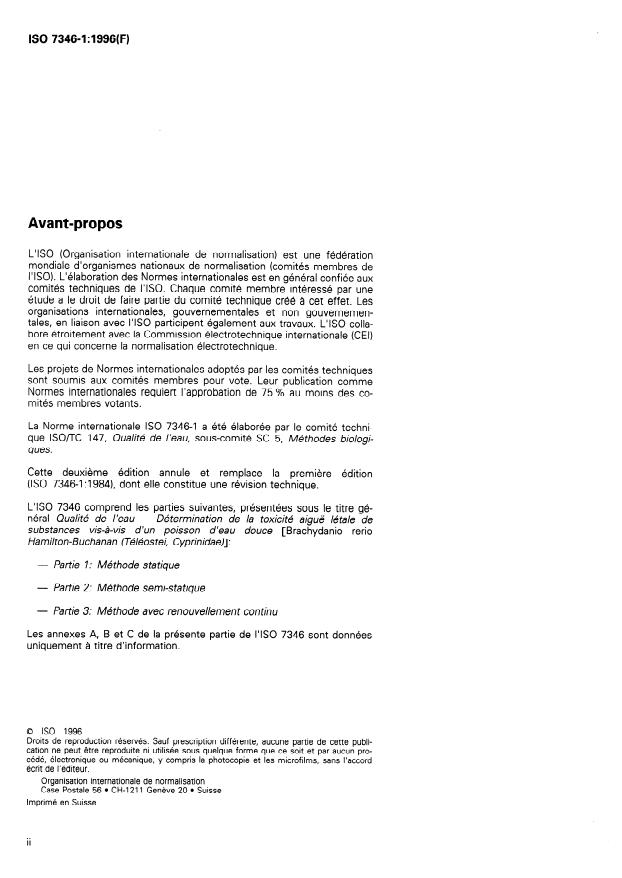 ![SIST ISO 7346-1:1997 ISO 7346-1:1996 - Qualité de l'eau -- Détermination de la toxicité aiguë létale de substances vis-a-vis d'un poisson d'eau douce [Brachydanio rerio Hamilton-Buchanan (Téléostei, Cyprinidae)] - Page 3 preview](https://cdn.standards.iteh.ai/images/14026/a9bd532e8c0b4ddb9280c63502976cfa/page3.jpg)