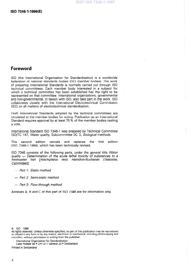 ![SIST ISO 7346-1:1997 ISO 7346-1:1996 - Water quality -- Determination of the acute lethal toxicity of substances to a freshwater fish [Brachydanio rerio Hamilton-Buchanan (Teleostei, Cyprinidae)] - Page 2 preview](https://cdn.standards.iteh.ai/images/14026/3ef832167ece41b7af71bd3f3f1368e7/page2.jpg)