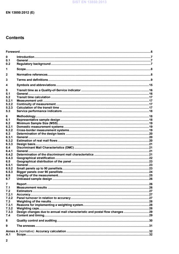 Foreword . 6 0 Introduction . 7 0.1 General . 7 0.2 Regulatory background . 7 1 Scope . 8 2 Normative references . 8 3 Terms and definitions . 9 4 Symbols and abbreviations . 15 5 Transit time as a Quality-of-Service indicator . 16 5.1 General . 16 5.2 Transit time calculation . 17 5.2.1 Measurement unit . 17 5.2.2 Continuity of measurement . 17 5.2.3 Calculation of the transit time . 17 5.3 Service performance indicators . 18 6 Methodology. 18 6.1 Representative sample design . 18 6.2 Minimum Sample Size (MSS) . 19 6.2.1 Domestic measurement systems . 19 6.2.2 Cross-border measurement systems . 19 6.3 Determination of the design basis . 20 6.3.1 General . 20 6.3.2 Estimation of real mail flows . 20 6.3.3 Design basis . 21 6.4 Discriminant Mail Characteristics (DMC) . 21 6.4.1 General . 21 6.4.2 Determination of the discriminant mail characteristics . 21 6.4.3 Geographical stratification . 22 6.5 Geographical distribution of the panel . 23 6.5.1 General . 23 6.5.2 Small panels up to 90 panellists . 23 6.5.3 Bigger panels over 90 panellists . 24 6.6 Integrity of the measurement. 25 6.7 Unbiased sample design . 26 7 Report . 26 7.1 Measurement results . 26 7.2 Estimators . 27 7.2.1 Accuracy. 27 7.2.2 Panel turnover in relation to accuracy . 27 7.3 Weighting of the results . 28 7.3.1 Reasons for implementing a weighting system . 28 7.3.2 Weighting caps. 28 7.3.3 Design changes due to annual mail characteristic and postal flow changes . 29 7.4 Content and timing. 29 8 Quality control and auditing . 30 9 The annexes . 31 Annex A (normative)