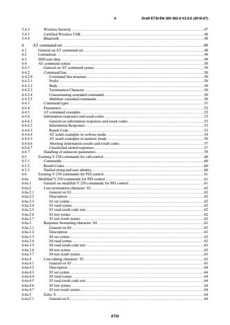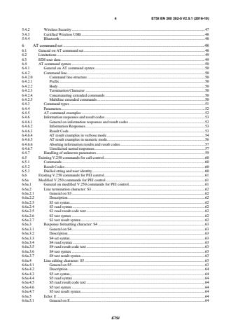 ETSI ETSI EN 300 392-5 V2.5.1 (2016-10) 4 5.4.2 Wireless Security . 47 5.4.3 Certified Wireless USB . 48 5.4.4 Bluetooth . 48 6 AT command set . 48 6.1 General on AT command set . 48 6.2 Limitations . 49 6.3 SDS user data . 49 6.4 AT command syntax . 50 6.4.1 General on AT command syntax . 50 6.4.2 Command line . 50 6.4.2.0 Command line structure . 50 6.4.2.1 Prefix . 50 6.4.2.2 Body . 50 6.4.2.3 Termination Character . 50 6.4.2.4 Concatenating extended commands . 50 6.4.2.5 Multiline extended commands . 50 6.4.3 Command types . 51 6.4.4 Parameters. 52 6.4.5 AT command examples . 52 6.4.6 Information responses and result codes . 53 6.4.6.1 General on information responses and result codes . 53 6.4.6.2 Information Responses . 53 6.4.6.3 Result Code . 53 6.4.6.4 AT result examples in verbose mode . 54 6.4.6.5 AT result examples in numeric mode. 56 6.4.6.6 Aborting information results and result codes. 57 6.4.6.7 Unsolicited nested responses . 57 6.4.7 Handling of unknown parameters . 59 6.5 Existing V.250 commands for call control . 60 6.5.1 Commands . 60 6.5.2 Result Codes . 60 6.5.3 Dialled string and user identity . 60 6.6 Existing V.250 commands for PEI control . 61 6.6a Modified V.250 commands for PEI control . 61 6.6a.1 General on modified V.250 commands for PEI control. 61 6.6a.2 Line termination character: S3 . 62 6.6a.2.1 General on S3 . 62 6.6a.2.2 Description . 62 6.6a.2.3 S3 set syntax. 62 6.6a.2.4 S3 read syntax . 62 6.6a.2.5 S3 read result code text . 62 6.6a.2.6 S3 test syntax . 62 6.6a.2.7 S3 test result syntax . 62 6.6a.3 Response formatting character: S4 . 63 6.6a.3.1 General on S4 . 63 6.6a.3.2 Description . 63 6.6a.3.3 S4 set syntax. 63 6.6a.3.4 S4 read syntax . 63 6.6a.3.5 S4 read result code text . 63 6.6a.3.6 S4 test syntax . 63 6.6a.3.7 S4 test result syntax . 63 6.6a.4 Line editing character: S5 . 63 6.6a.4.1 General on S5 . 63 6.6a.4.2 Description . 64 6.6a.4.3 S5 set syntax. 64 6.6a.4.4 S5 read syntax . 64 6.6a.4.5 S5 read result code text . 64 6.6a.4.6 S5 test syntax . 64 6.6a.4.7 S5 test result syntax . 64 6.6a.5 Echo: E . 64 6.6a.5.1 General on E. 64 SIST EN 300 392-5 V2.5.1:2016