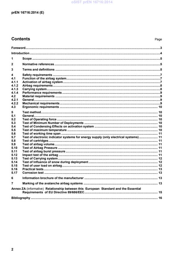 oSIST prEN 16716:2014 is a draft published by the Slovenian Institute for Standardization (SIST). Its full title is "Mountaineering equipment - Avalanche airbag systems - Safety requirements and test methods". This standard covers: The standard is applicable for avalanche airbag systems with the purpose to keep the user on top of the snow in case of an avalanche accident. It gives safety requirements and test methods.
