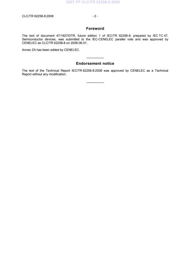 SIST-TP CLC/TR 62258-8:2008 is classified under the following ICS (International Classification for Standards) categories: 31.080.99 - Other semiconductor devices; 31.200 - Integrated circuits. Microelectronics. The ICS classification helps identify the subject area and facilitates finding related standards.