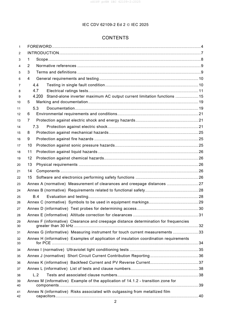 - Physical requirements, components, and software/electronics performing safety functions, plus annexes on clearances/creepage, UV conditioning, backfeed/current reporting, and more.