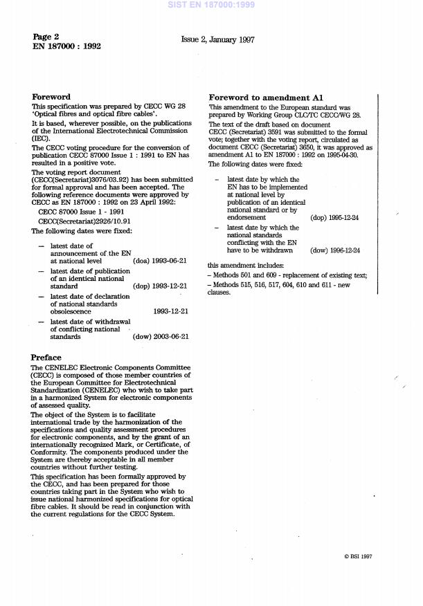 기사는 SIST EN 187000:1999에 대해 논의하며, 이는 광섬유 케이블에 대한 일반적인 명세입니다. 이 명세는 CECC 87 000 Issue 1:1991을 대체한다고 언급합니다. 또한, SIST EN 187000:1999가 EN 60794-1-2:1999 및 EN 60794-1-1:2002에 의해 대체되었다고 언급되었습니다.