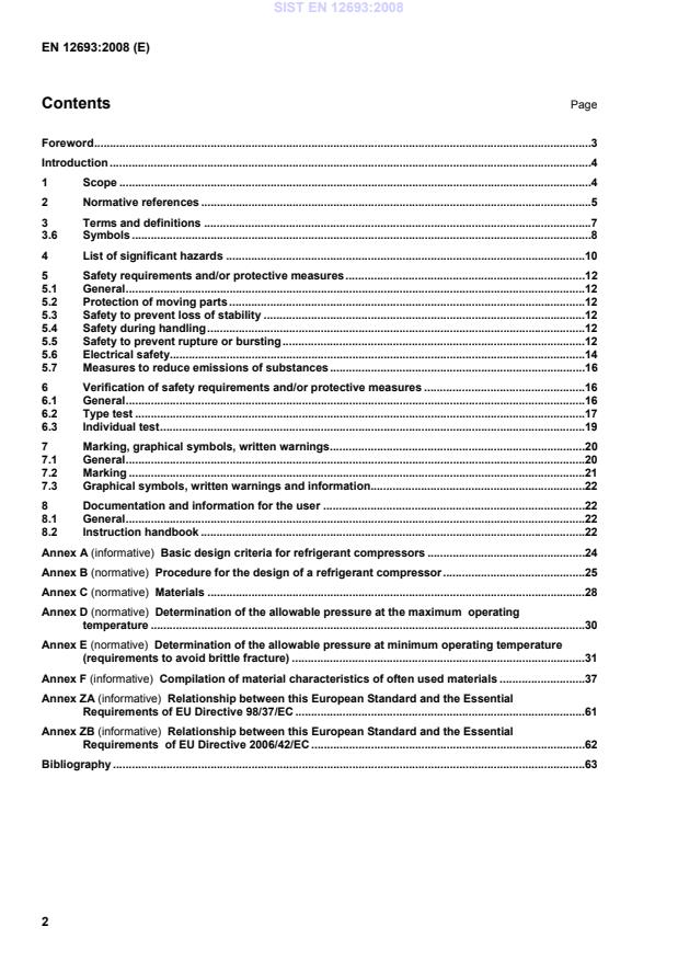 Compressors for automotive comfort air conditioning systems can be developed according e.g. SAE J 639. NOTE 2 Noise emission depends on the complete installation of the built-in compressors and the corresponding operating conditions. For semi-hermetic and open drive compressors which include moving parts and for which the external envelope is primarily designed for mechanical loads, thermal loads (to limit the possible deformation due to temperature), stiffness of the structure (external mechanical loads and weight of the equipment), taking into account established safe industrial practice, it is considered that pressure is not a significant design factor. Attached parts covering other functions e.g. oil separators, oil coolers, suction accumulators shall comply to EN 14276-1 or EN 13445-6 (cast iron) or EN 13445-8 (aluminium) or showing compliance to the relevant European requirements. This applies also to shells for hermetic compressors either welded or with any kind of permanent joint. Requirements for compressors used in explosive atmospheres are not covered by this standard. NOTE 3 For further guidance see EN 13463-1. This standard deals with all significant hazards, hazardous situations and events relevant to compressors, when they are used as intended and under conditions for misuse which are reasonably foreseeable by the manufacturer (see Clause 4). SIST EN 12693:2008