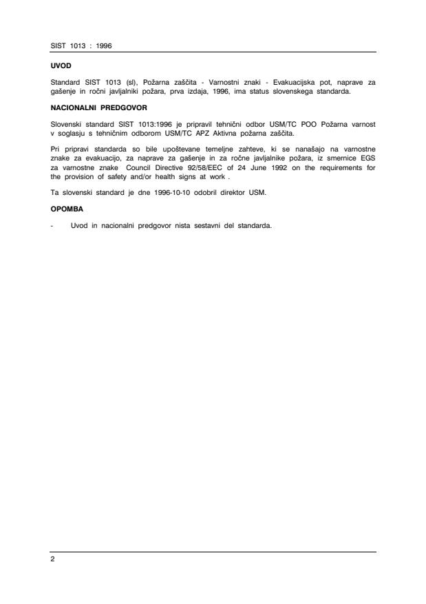 SIST 1013 : 19962UVODStandard SIST 1013 (sl), Po`arna za{~ita - Varnostni znaki - Evakuacijska pot, naprave zaga{enje in ro~ni javljalniki po`ara, prva izdaja, 1996, ima status slovenskega standarda.NACIONALNI PREDGOVORSlovenski standard SIST 1013:1996 je pripravil tehni~ni odbor USM/TC POO Po`arna varnostv soglasju s tehni~nim odborom USM/TC APZ Aktivna po`arna za{~ita.Pri pripravi standarda so bile upo{tevane temeljne zahteve, ki se nana{ajo na varnostneznake za evakuacijo, za naprave za ga{enje in za ro~ne javljalnike po`ara, iz smernice EGSza varnostne znake “Council Directive 92/58/EEC of 24 June 1992 on the requirements forthe provision of safety and/or health signs at work”.Ta slovenski standard je dne 1996-10-10 odobril direktor USM.OPOMBA-Uvod in nacionalni predgovor nista sestavni del standarda.