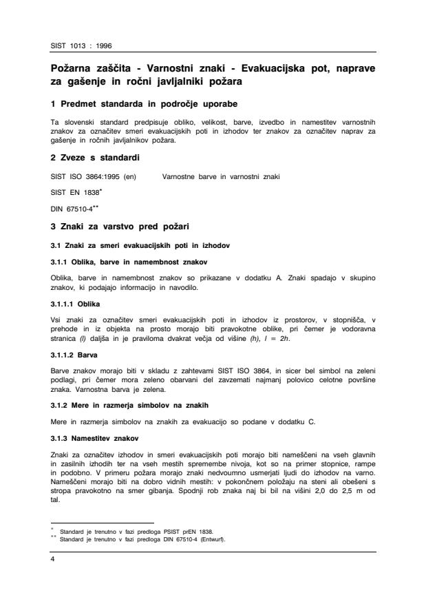 SIST 1013 : 19964Po`arna za{~ita - Varnostni znaki - Evakuacijska pot, napraveza ga{enje in ro~ni javljalniki po`ara1 Predmet standarda in podro~je uporabeTa slovenski standard predpisuje obliko, velikost, barve, izvedbo in namestitev varnostnihznakov za ozna~itev smeri evakuacijskih poti in izhodov ter znakov za ozna~itev naprav zaga{enje in ro~nih javljalnikov po`ara.2 Zveze s standardiSIST ISO 3864:1995 (en)Varnostne barve in varnostni znakiSIST EN 1838*DIN 67510-4**3 Znaki za varstvo pred po`ari3.1 Znaki za smeri evakuacijskih poti in izhodov3.1.1 Oblika, barve in namembnost znakovOblika, barve in namembnost znakov so prikazane v dodatku A. Znaki spadajo v skupinoznakov, ki podajajo informacijo in navodilo.3.1.1.1 OblikaVsi znaki za ozna~itev smeri evakuacijskih poti in izhodov iz prostorov, v stopni{~a, vprehode in iz objekta na prosto morajo biti pravokotne oblike, pri ~emer je vodoravnastranica (l) dalj{a in je praviloma dvakrat ve~ja od vi{ine (h), l = 2h.3.1.1.2 BarvaBarve znakov morajo biti v skladu z zahtevami SIST ISO 3864, in sicer bel simbol na zelenipodlagi, pri ~emer mora zeleno obarvani del zavzemati najmanj polovico celotne povr{ineznaka. Varnostna barva je zelena.3.1.2 Mere in razmerja simbolov na znakihMere in razmerja simbolov na znakih za evakuacijo so podane v dodatku C.3.1.3 Namestitev znakovZnaki za ozna~itev izhodov in smeri evakuacijskih poti morajo biti name{~eni na vseh glavnihin zasilnih izhodih ter na vseh mestih spremembe nivoja, kot so na primer stopnice, rampein podobno. V primeru po`ara morajo znaki nedvoumno usmerjati ljudi do izhodov na varno.Name{~eni morajo biti na dobro vidnih mestih: v pokon~nem polo`aju na steni ali obe{eni sstropa pravokotno na smer gibanja. Spodnji rob znaka naj bi bil na vi{ini 2,0 do 2,5 m odtal.