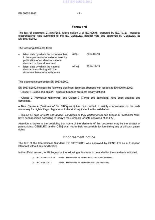 SIST EN 60676:2002 - Industrial electroheating equipment - Test methods for direct arc furnaces - Effective Date