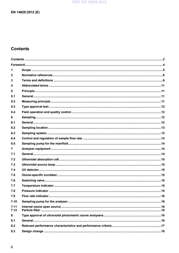 Contents Contents . 2Foreword . 41Scope . 52Normative references . 63Terms and definitions . 64Abbreviated terms . 115Principle . 115.1General . 115.2Measuring principle . 115.3Type approval test . 125.4Field operation and quality control . 126Sampling . 126.1General . 126.2Sampling location . 136.3Sampling system . 136.4Control and regulation of sample flow rate . 146.5Sampling pump for the manifold . 147Analyser equipment . 147.1General . 147.2Ultraviolet absorption cell . 157.3Ultraviolet source lamp . 157.4UV detector . 157.5Ozone-specific scrubber . 157.6Switching valve . 157.7Temperature indicator . 157.8Pressure indicator . 157.9Flow rate indicator . 167.10Sampling pump for the analyser . 167.11Internal ozone span source . 167.12Particle filter . 168Type approval of ultraviolet photometric ozone analysers . 168.1General . 168.2Relevant performance characteristics and performance criteria . 178.3Design change . 18SIST EN 14625:2012