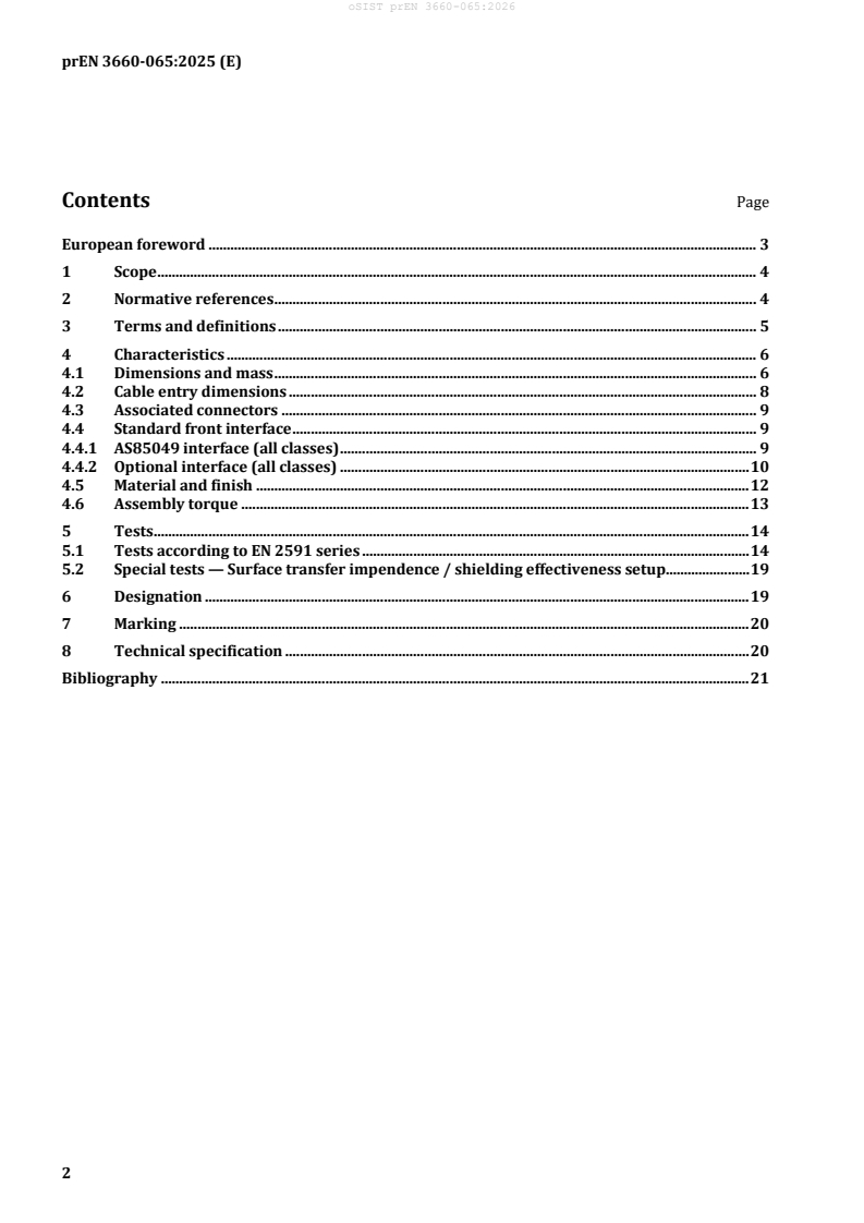 - References extensive test methods (EN 2591 series) including visual, dimensional, electrical continuity, surface transfer impedance, shielding effectiveness (100 MHz–1 GHz), lightning strike, temperature endurance, salt mist, vibration, shock, mechanical endurance, and mating/unmating forces.