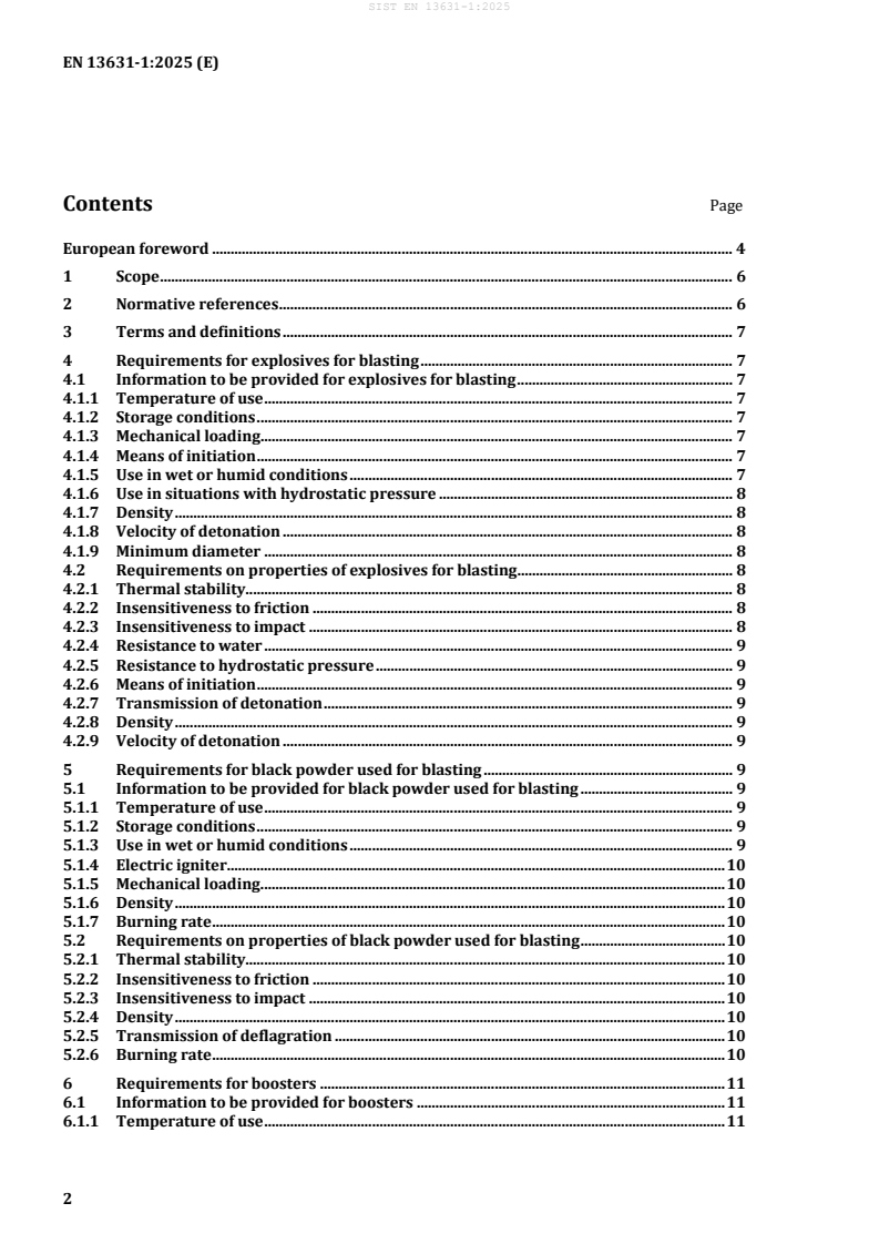 Keywords: EN 13631-1:2025, explosives for civil uses, explosives for blasting, boosters, black powder, requirements, CEN, thermal stability, insensitiveness, water resistance, velocity of detonation.