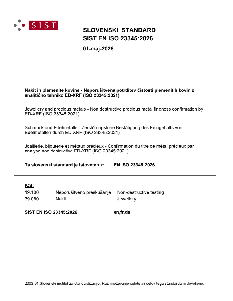 SIST EN ISO 23345:2026 is a standard published by the Slovenian Institute for Standardization (SIST). Its full title is "Jewellery and precious metals - Non destructive precious metal fineness confirmation by ED-XRF (ISO 23345:2021)". This standard covers: This document describes a non-destructive method to verify (confirm) the precious metal fineness of finished and semifinished jewellery item(s) considered homogeneous by ED-XRF (energy dispersive X-ray fluorescence), including alloys according to ISO 9202. This document is not suitable for any coated items. WD-XRF (wavelength dispersive X-ray fluorescence) equipment cannot be used.