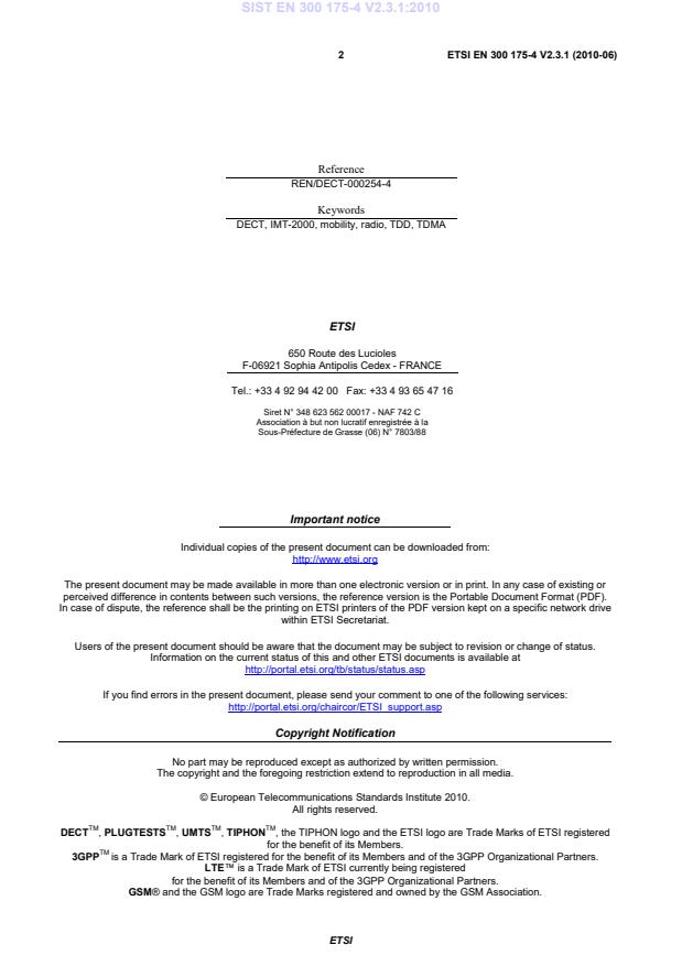 DECTTM, PLUGTESTSTM, UMTSTM, TIPHONTM, the TIPHON logo and the ETSI logo are Trade Marks of ETSI registered for the benefit of its Members. 3GPPTM is a Trade Mark of ETSI registered for the benefit of its Members and of the 3GPP Organizational Partners. LTE™ is a Trade Mark of ETSI currently being registered for the benefit of its Members and of the 3GPP Organizational Partners. GSM® and the GSM logo are Trade Marks registered and owned by the GSM Association. SIST EN 300 175-4 V2.3.1:2010
