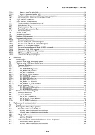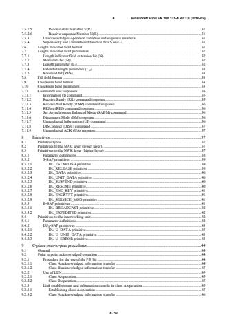 ETSI ETSI EN 300 175-4 V2.3.1 (2010-06) 4 7.5.2.5 Receive state Variable V(R) . 30 7.5.2.6 Receive sequence Number N(R) . 30 7.5.3 Unacknowledged operation variables and sequence numbers . 30 7.5.4 Supervisory and Unnumbered function bits S and U . 30 7.6 Length indicator field format. 30 7.7 Length indicator field parameters . 31 7.7.1 Length indicator field extension bit (N) . 31 7.7.2 More data bit (M) . 31 7.7.3 Length parameter (LI) . 31 7.7.4 Extended length parameter (LJJ) . 32 7.7.5 Reserved bit (RES) . 32 7.8 Fill field format . 32 7.9 Checksum field format . 32 7.10 Checksum field parameters . 32 7.11 Commands and responses . 34 7.11.1 Information (I) command . 34 7.11.2 Receive Ready (RR) command/response . 34 7.11.3 Receive Not Ready (RNR) command/response . 35 7.11.4 REJect (REJ) command/response . 35 7.11.5 Set Asynchronous Balanced Mode (SABM) command . 35 7.11.6 Disconnect Mode (DM) response . 35 7.11.7 Unnumbered Information (UI) command . 35 7.11.8 DISConnect (DISC) command . 36 7.11.9 Unnumbered ACK (UA) response . 36 8 Primitives . 36 8.1 Primitive types . 36 8.2 Primitives to the MAC layer (lower layer) . 36 8.3 Primitives to the NWK layer (higher layer) . 36 8.3.1 Parameter definitions . 37 8.3.2 S-SAP primitives . 38 8.3.2.1 DL_ESTABLISH primitive . 38 8.3.2.2 DL_RELEASE primitive . 38 8.3.2.3 DL_DATA primitive . 39 8.3.2.4 DL_UNIT_DATA primitive . 39 8.3.2.5 DL_SUSPEND primitive . 39 8.3.2.6 DL_RESUME primitive . 39 8.3.2.7 DL_ENC_KEY primitive . 40 8.3.2.8 DL_ENCRYPT primitive . 40 8.3.2.9 DL_SERVICE_MOD primitive . 40 8.3.3 B-SAP primitives . 40 8.3.3.1 DL_BROADCAST primitive . 41 8.3.3.2 DL_EXPEDITED primitive . 41 8.4 Primitives to the interworking unit . 41 8.4.1 Parameter definitions . 41 8.4.2 LUX-SAP primitives . 42 8.4.2.1 DL_U_DATA primitive . 42 8.4.2.2 DL_U_UNIT_DATA primitive . 42 8.4.2.3 DL_U_ERROR primitive . 42 9 C-plane peer-to-peer procedures . 43 9.1 General . 43 9.2 Point to point acknowledged operation . 43 9.2.1 Procedure for the use of the P/F bit . 43 9.2.1.1 Class A acknowledged information transfer . 43 9.2.1.2 Class B acknowledged information transfer . 44 9.2.2 Use of LLN . 44 9.2.2.1 Class A operation . 44 9.2.2.2 Class B operation . 44 9.2.3 Link establishment and information transfer in class A operation . 44 9.2.3.1 Establishing class A operation . 44 9.2.3.2 Class A acknowledged information transfer . 45 SIST EN 300 175-4 V2.3.1:2010