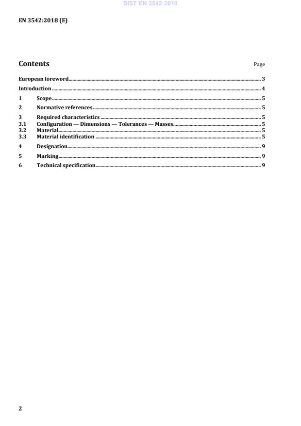 Page European foreword . 3 Introduction . 4 1 Scope . 5 2 Normative references . 5 3 Required characteristics . 5 3.1 Configuration — Dimensions — Tolerances — Masses . 5 3.2 Material . 5 3.3 Material identification . 5 4 Designation. 9 5 Marking . 9 6 Technical specification . 9