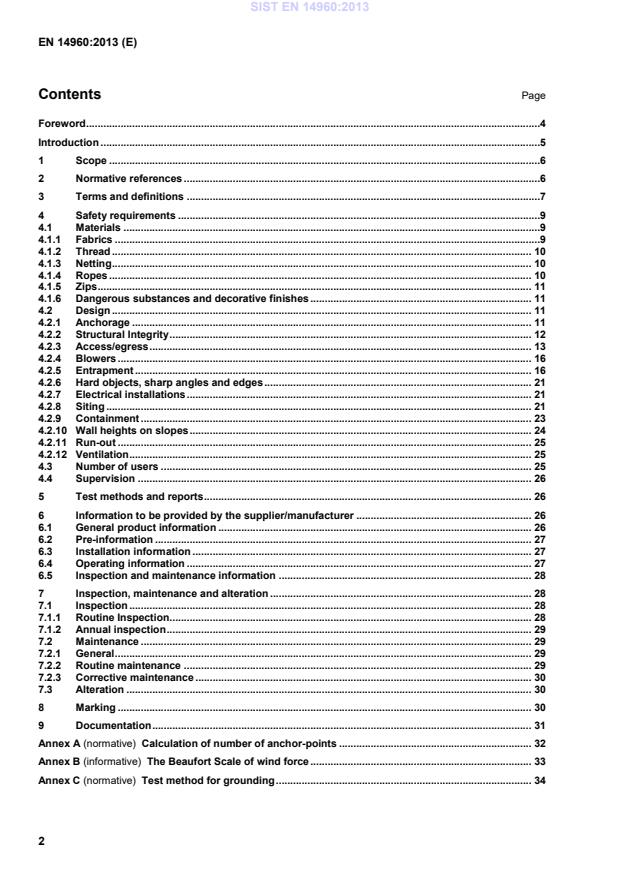 This standard specifies the requirements that will protect a child from hazards that he or she may be unable to foresee when using the equipment as intended, or in a manner that can be reasonably anticipated. This standard is not applicable to inflatable water-borne play and leisure equipment, domestic inflatable toys, air-supported buildings, inflatables used solely for protection, inflatables used for rescue, or other types of inflatable toys where the primary activity is not bouncing or sliding. 2 Normative references The following documents, in whole or in part, are normatively referenced in this document and are indispensable for its application. For dated references, only the edition cited applies. For undated references, the latest edition of the referenced document (including any amendments) applies. EN 71-3, Safety of toys — Part 3: Migration of certain elements EN 1177, Impact attenuating playground surfacing — Determination of critical fall height EN 60529, Degrees of protection provided by enclosures (IP code) (IEC 60529/A1) EN ISO 1421:1998, Rubber- or plastics-coated fabrics — Determination of tensile strength and elongation at break (ISO 1421:1998) EN ISO 2307, Fibre ropes — Determination of certain physical and mechanical properties (ISO 2307) EN ISO 2411, Rubber- or plastics-coated fabrics — Determination of coating adhesion (ISO 2411) EN ISO 9554, Fibre ropes — General specifications (ISO 9554) EN ISO/IEC 17025, General requirements for the competence of testing and calibration laboratories (ISO/IEC 17025) SIST EN 14960:2013