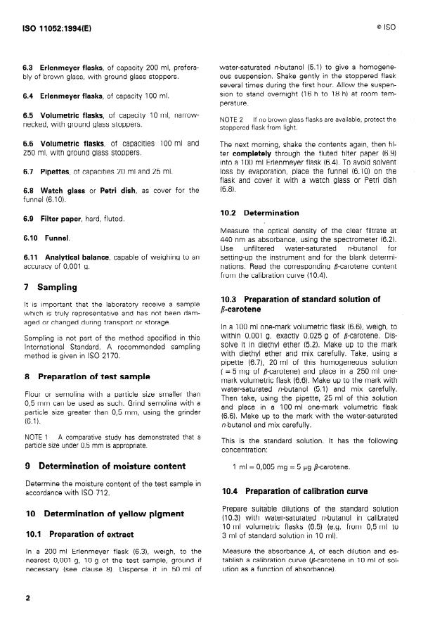 IS0 11052:1994(E) 0 IS0 6.3 Erlenmeyer flasks, of capacity 200 ml, prefera- bly of brown glass, with ground glass stoppers. 6.4 Erlenmeyer flasks, of capacity 100 ml. 6.5 Volumetric flasks, of capacity 10 ml, narrow- necked, with ground glass stoppers. 6.6 Volumetric flasks, of capacities 100 ml and 250 ml, with ground glass stoppers. 6.7 Pipettes, of capacities 20 ml and 25 ml. 6.8 Watch glass or Petri dish, as cover for the funnel (6.10). water-saturated n-butanol (5.1) to give a homogene- ous suspension. Shake gently in the stoppered flask several times during the first hour. Allow the suspen- sion to stand overnight (16 h to 18 h) at room tem- perature. NOTE 2 If no brown glass flasks are available, protect the stoppered flask from light. The next morning, shake the contents again, the ter completely through the fluted filter paper into a 100 ml Erlenmeyer flask (6.4). To avoid sol loss by evaporation, place the funnel (6.10) on flask and cover it with a watch glass or Petri (6.8). 10.2 Determination 6.9 Filter paper, hard, fluted. 6.10 Funnel. 6.11 Analytical balance, capable of weighing to an accuracy of 0,001 g. 7 Sampling