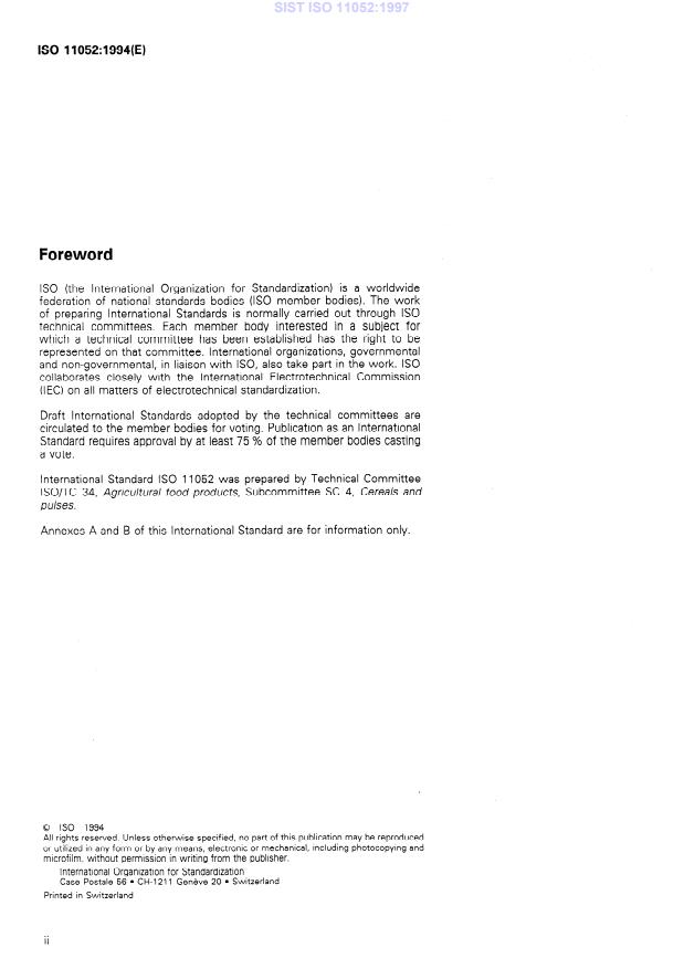 IS0 11052:1994(E) Foreword IS0 (the International Organization for Standardization) is a worldwide federation of national standards bodies (IS0 member bodies). The work of preparing International Standards is normally carried out through IS0 technical committees. Each member body interested in a subject for which a technical committee has been established has the right to be represented on that committee. International organizations, governmental and non-governmental, in liaison with ISO, also take part in the work. IS0 collaborates closely with the International Electrotechnical Commission (IEC) on all matters of electrotechnical standardization. Draft International Standards adopted by the technical committees are circulated to the member bodies for voting. Publication as an International Standard requires approval by at least 75 % of the member bodies casting a vote. International Standard IS0 11052 was prepared by Technical Committee ISODC 34, Agricultural food products, Subcommittee SC 4, Cereals and pulses. Annexes A and B of this International Standard are for information only. . 0 IS0 1994 All rights reserved. Unless otherwise specified, no part of this publication may be reproduced or utilized in any form or by any means, electronic or mechanical, including photocopying and microfilm, without permission in writing from the publisher. International Organization for Standardizati0.n Case Postale 56 l CH-1211 Geneve 20 l Switzerland Printed in Switzerland SIST ISO 11052:1997