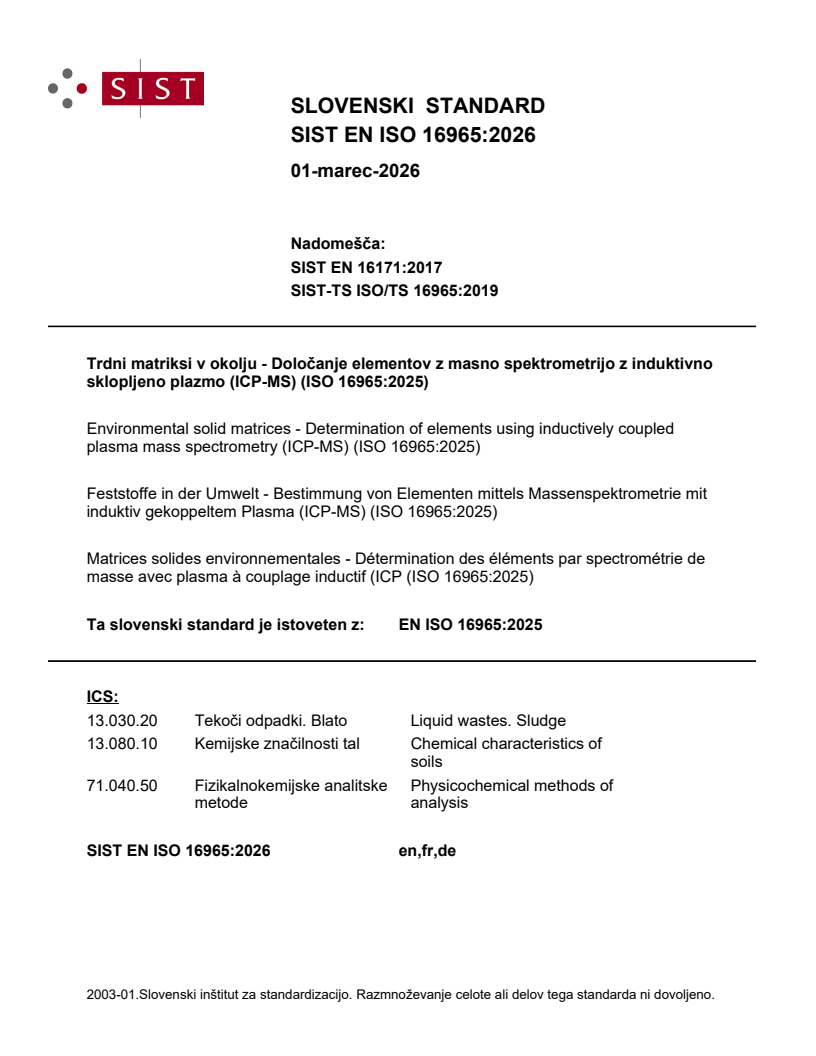 SIST EN ISO 16965:2026 is a standard published by the Slovenian Institute for Standardization (SIST). Its full title is "Environmental solid matrices - Determination of elements using inductively coupled plasma mass spectrometry (ICP-MS) (ISO 16965:2025)". This standard covers: This document specifies a method for the determination of the following elements in aqua regia, nitric acid or mixture of hydrochloric (HCl), nitric (HNO3) and tetrafluoroboric (HBF4)/hydrofluoric (HF) acid digests of soil, treated biowaste, waste, sludge and sediment: aluminium (Al), antimony (Sb), arsenic (As), barium (Ba), beryllium (Be), bismuth (Bi), boron (B), cadmium (Cd), calcium (Ca), cerium (Ce), caesium (Cs), chromium (Cr), cobalt (Co), copper (Cu), dysprosium (Dy), erbium (Er), europium (Eu), gadolinium (Gd), gallium (Ga), germanium (Ge), gold (Au), hafnium (Hf), holmium (Ho), indium (In), iridium (Ir), iron (Fe), lanthanum (La), lead (Pb), lithium (Li), lutetium (Lu), magnesium (Mg), manganese (Mn), mercury (Hg), molybdenum (Mo), neodymium (Nd), nickel (Ni), palladium (Pd), phosphorus (P), platinum (Pt), potassium (K), praseodymium (Pr), rhenium (Re), rhodium (Rh), rubidium (Rb), ruthenium (Ru), samarium (Sm), scandium (Sc), selenium (Se), silicon (Si), silver (Ag), sodium (Na), strontium (Sr), sulfur (S), tellurium (Te), terbium (Tb), thallium (Tl), thorium (Th), thulium (Tm), tin (Sn), titanium (Ti), tungsten (W), uranium (U), vanadium (V), ytterbium (Yb), yttrium (Y), zinc (Zn), and zirconium (Zr). NOTE 1 Details on validation are given in Annex A. This method is also applicable for the determination of major, minor and trace elements in aqua regia and nitric acid digests and in eluates of construction products (EN 17200[7]). NOTE 2 Construction products include e.g. mineral-based products, bituminous products, metals, wood-based products, plastics and rubbers, sealants and adhesives, paints and coatings.