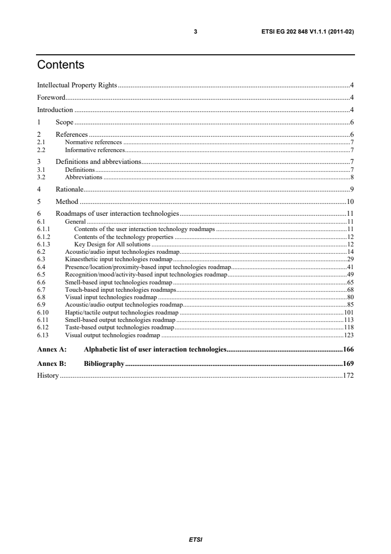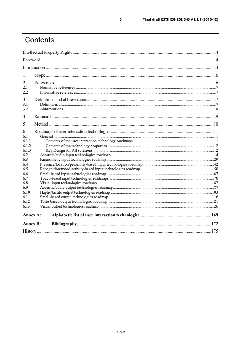 The present document lists user interaction technologies likely to be employed in future devices and services in the form of a technology roadmap. For each identified technology, key characteristics specified include: