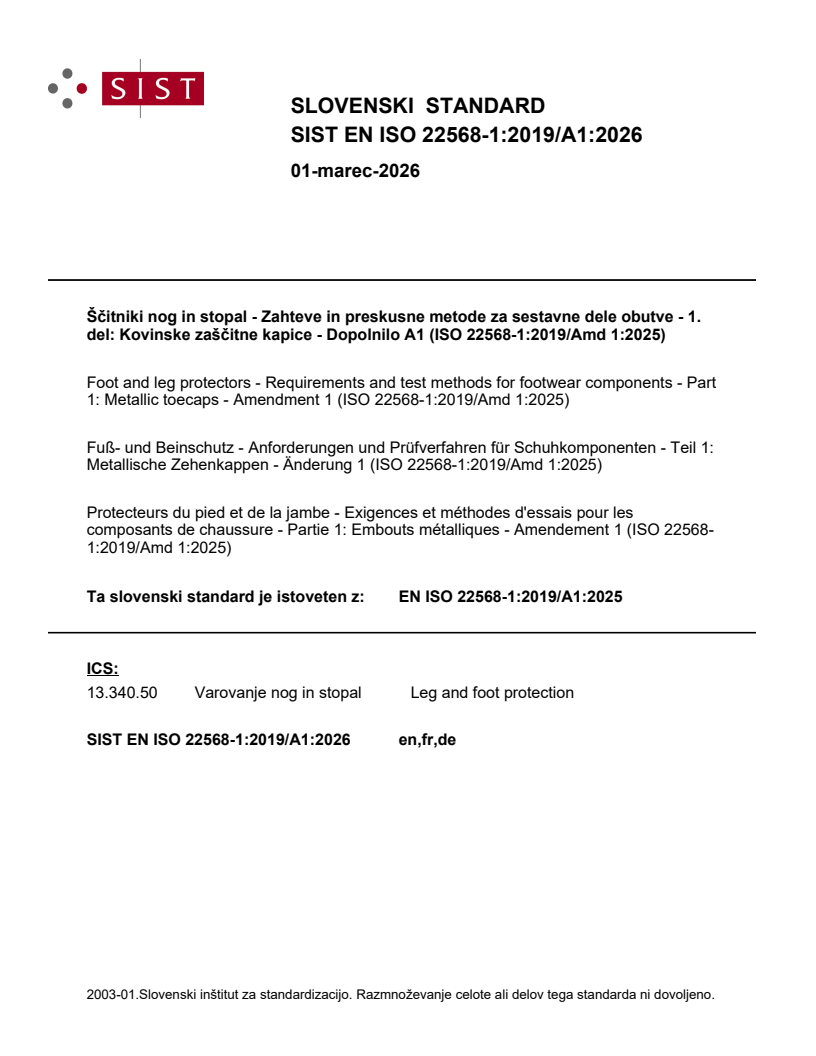 SIST EN ISO 22568-1:2019/A1:2026 is a amendment published by the Slovenian Institute for Standardization (SIST). Its full title is "Foot and leg protectors - Requirements and test methods for footwear components - Part 1: Metallic toecaps - Amendment 1 (ISO 22568-1:2019/Amd 1:2025)". This standard covers: Foot and leg protectors - Requirements and test methods for footwear components - Part 1: Metallic toecaps - Amendment 1 (ISO 22568-1:2019/Amd 1:2025)