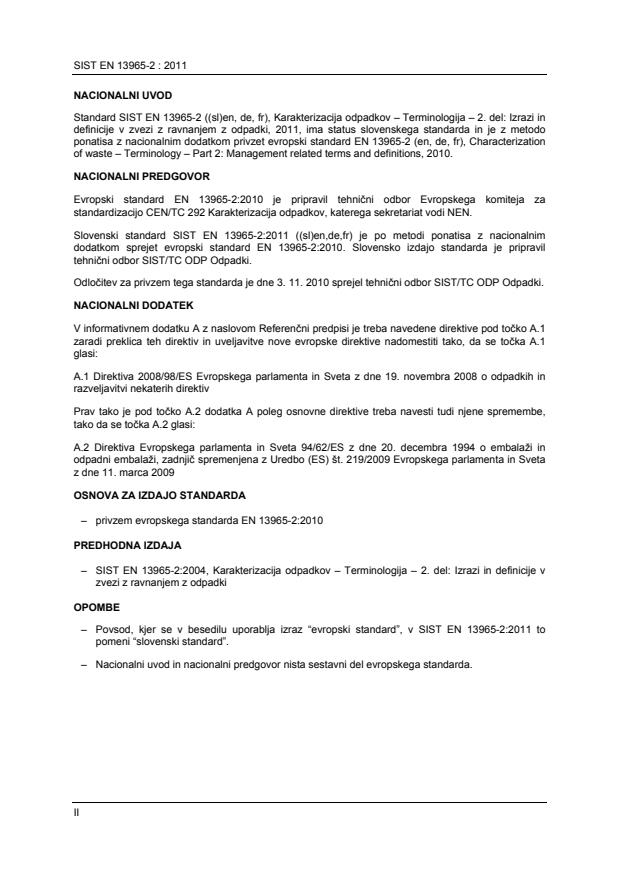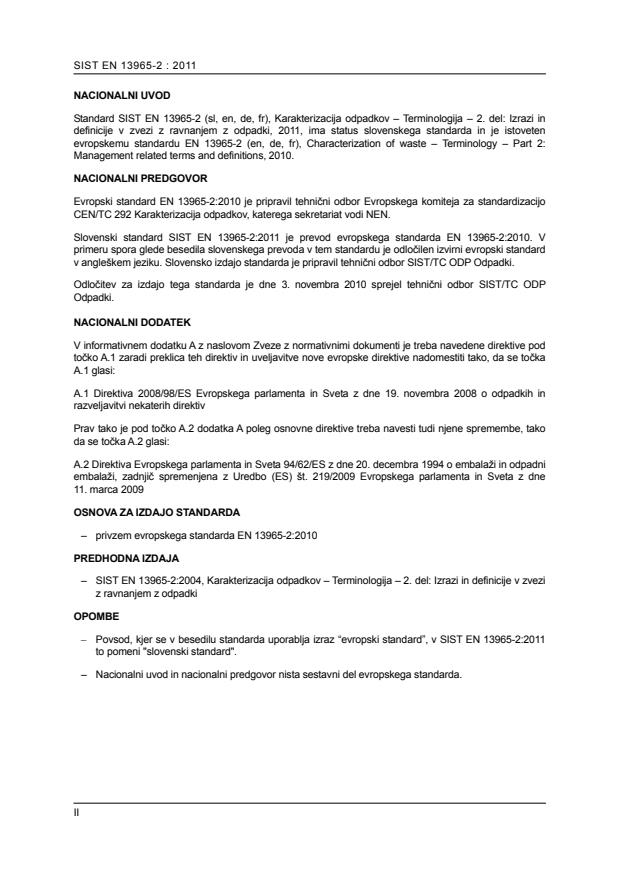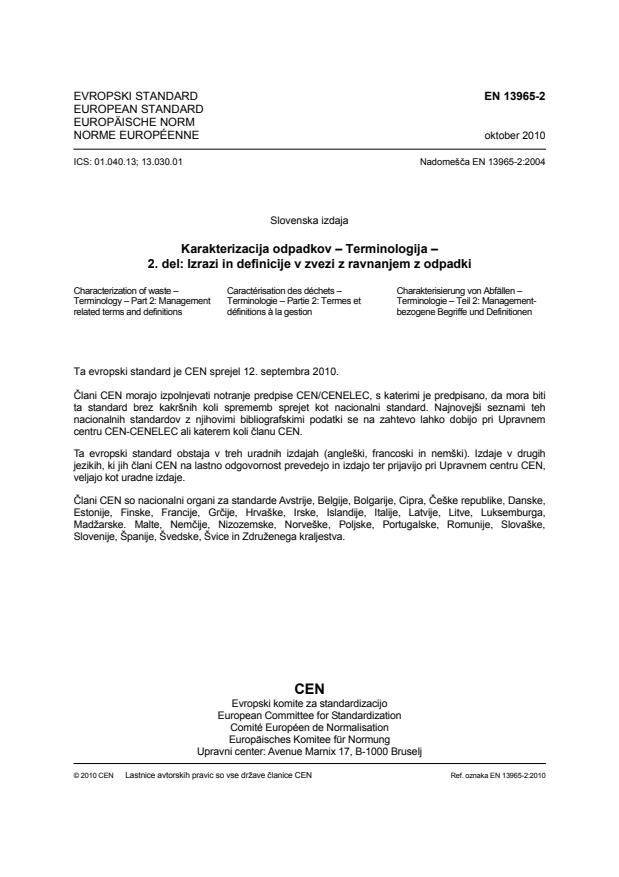 Ta evropski standard, EN 13965-2, karakterizacija odpadkov - terminologija – 2. del: Izrazi in definicije v zvezi z ravnanjem z odpadki - terminologija, podaja kompilacijo izbranih in posodobljenih izrazov in definicij, ki jih uporabljajo na primer proizvajalci, industrija odpadkov in zakonodajalci na področju upravljanja z odpadki. Usklajen je s trenutnim jezikom, ki se uporablja pri upravljanju kot tudi v pravni ureditvi. Skupaj z referencami (glej Dodatek A) vključuje nacionalne izraze in definicije, kjer so bile potrebe po njih izražene. Ne vključuje izrazov, ki se nanašajo na podrobne dejavnosti.