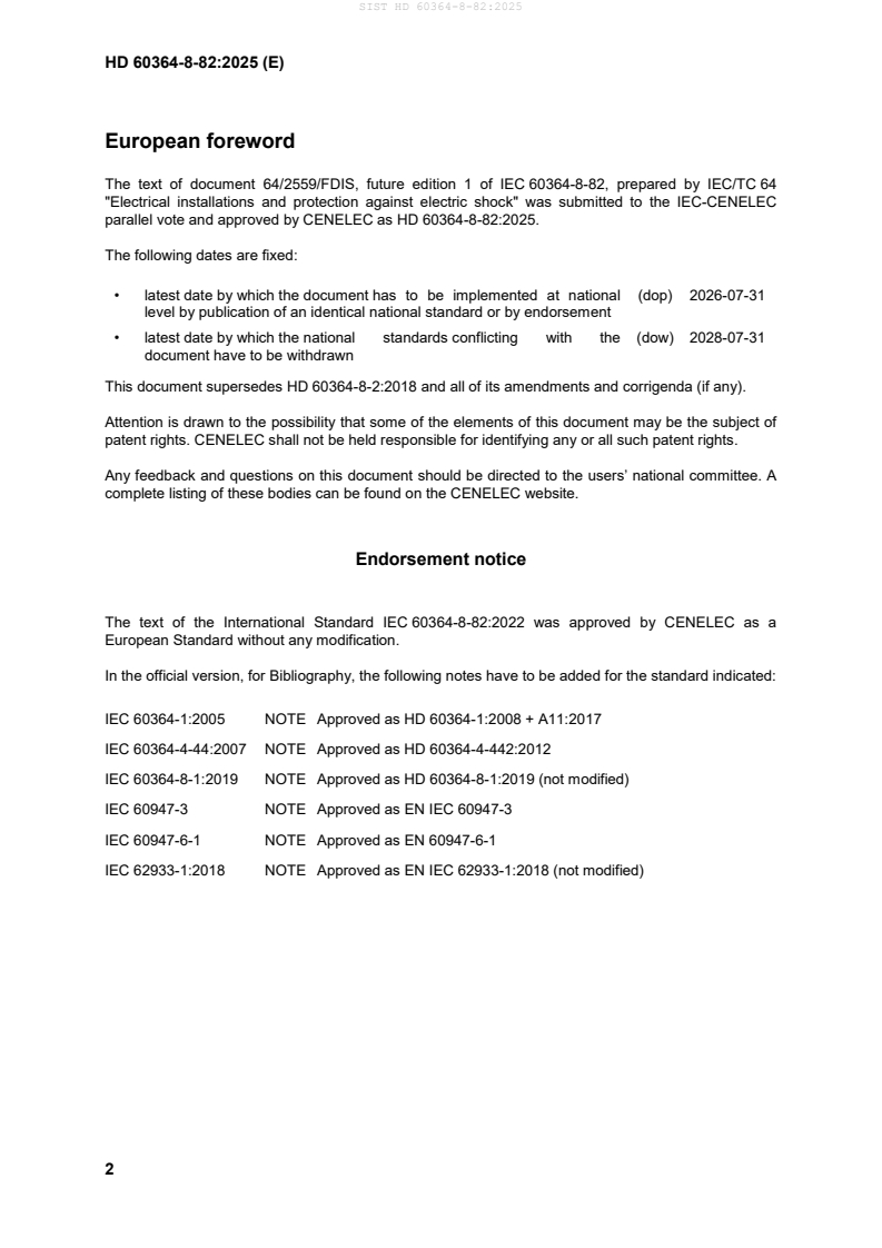 SIST HD 60364-8-82:2025 has the following relationships with other standards: It is inter standard links to SIST HD 60364-8-2:2019, SIST HD 60364-8-2:2019/A11:2019, SIST HD 60364-8-2:2019/A12:2021, SIST HD 60364-8-82:2025/A11:2025, kSIST FprHD 60364-8-82:2022/oprA1:2025. Understanding these relationships helps ensure you are using the most current and applicable version of the standard.