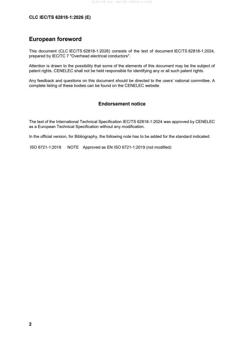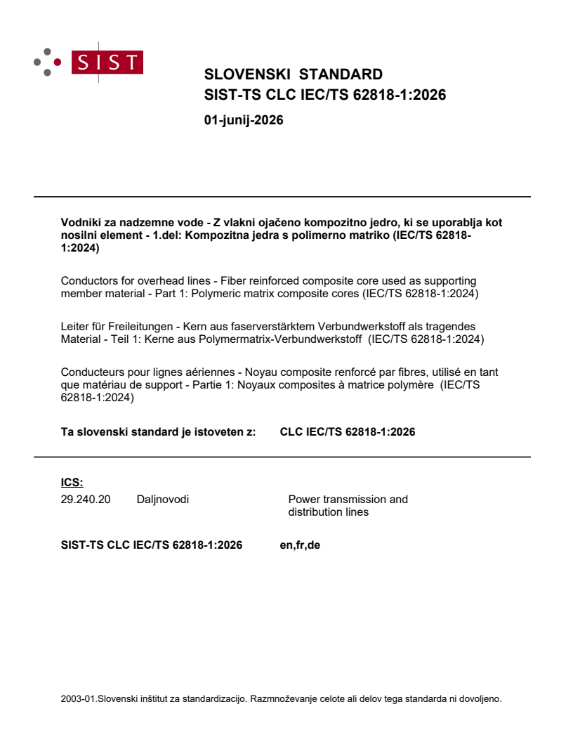 SIST-TS CLC IEC/TS 62818-1:2026 is a technical specification published by the Slovenian Institute for Standardization (SIST). Its full title is "Conductors for overhead lines - Fiber reinforced composite core used as supporting member material - Part 1: Polymeric matrix composite cores (IEC/TS 62818-1:2024)". This standard covers: Part 1: This part of IEC 62818, which is a Technical Specification, establishes a system of fiber reinforced composite core used as supporting member material in conductors for overhead lines which may be used as the basis for specifications. This document is applicable to fiber reinforced composite core, with polymeric matrix, used as supporting member material in conductors for overhead lines. This document gives guidance on: – defining the common terms used for fiber reinforced composite core with polymeric matrix, – prescribing common methods and recommendations to characterize the properties of fiber reinforced composite core based on single or multi-wires with PMC (Polymeric Matrix Composite) used as supporting member material in conductors, – prescribing or recommending acceptance or failure criteria when applicable. These tests, criteria and recommendations are intended to ensure a satisfactory use and quality under normal operating and environmental conditions. This document does not apply to compliance criteria which may be required but indicative values could be given in Annexes for guidance.
