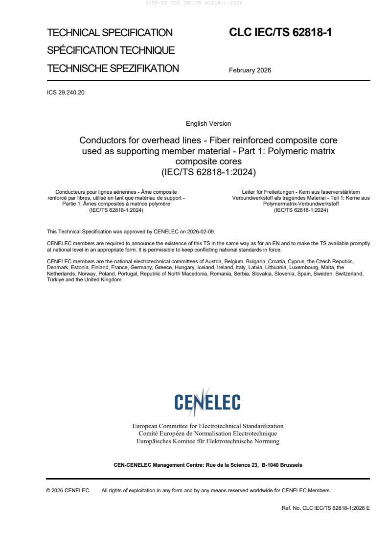 Conductors for overhead lines - Fiber reinforced composite core used as supporting member material - Part 1: Polymeric matrix composite cores (IEC/TS 62818-1:2024)