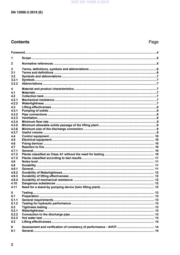 Clauses of this European Standard addressing the provisions of the EU Construction Products Regulation . 26 ZA.1 Scope and relevant characteristics . 26 ZA.2 Procedure for AVCP of lifting plants for faecal free wastewater . 28 ZA.2.1 System(s) of AVCP . 28 ZA.2.2 Declaration of performance (DoP) . 31 ZA.2.2.1 General . 31 ZA.2.2.2 Content. 32 ZA.2.2.3 Example of DoP . 33 ZA.3 CE marking and labelling. 35 Bibliography . 38 SIST EN 12050-2:2015