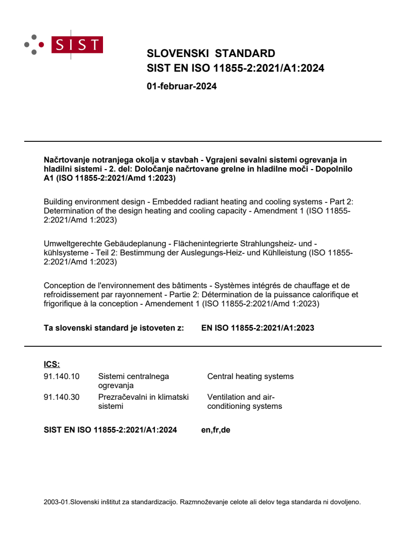 SIST EN ISO 11855-2:2021/A1:2024 is a amendment published by the Slovenian Institute for Standardization (SIST). Its full title is "Building environment design - Embedded radiant heating and cooling systems - Part 2: Determination of the design heating and cooling capacity - Amendment 1 (ISO 11855-2:2021/Amd 1:2023)". This standard covers: Building environment design - Embedded radiant heating and cooling systems - Part 2: Determination of the design heating and cooling capacity - Amendment 1 (ISO 11855-2:2021/Amd 1:2023)