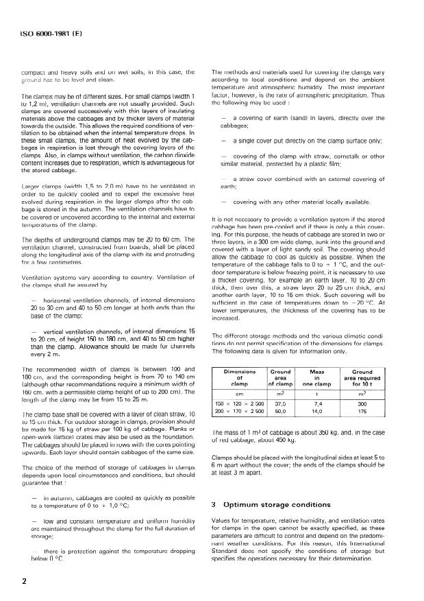 ISO 6000:1981 provides practical guidance for the outdoor storage of round-headed cabbage (Brassica oleracea var. capitata, white and red). The standard covers pre-harvest and harvest measures, drying and handling, construction and operation of clamps (temporary outdoor silos), and monitoring and termination of storage to maintain quality for consumption or industrial use. Annex A lists recommended long-keeping varieties; Annex B discusses the influence of production area and unforeseen storage difficulties.