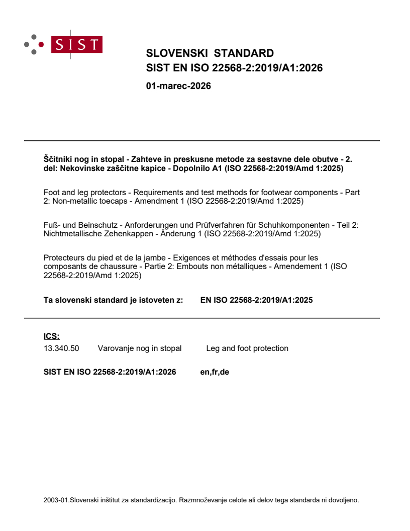 SIST EN ISO 22568-2:2019/A1:2026 is a amendment published by the Slovenian Institute for Standardization (SIST). Its full title is "Foot and leg protectors - Requirements and test methods for footwear components - Part 2: Non-metallic toecaps - Amendment 1 (ISO 22568-2:2019/Amd 1:2025)". This standard covers: Foot and leg protectors - Requirements and test methods for footwear components - Part 2: Non-metallic toecaps - Amendment 1 (ISO 22568-2:2019/Amd 1:2025)