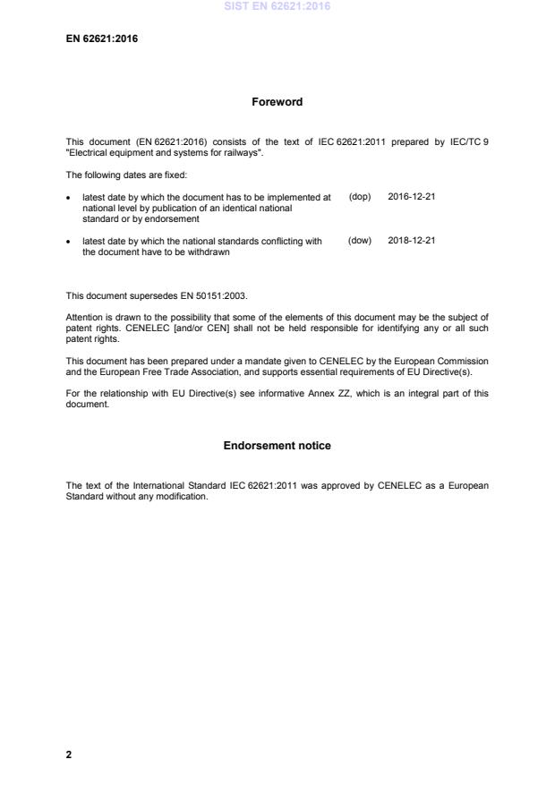 Correspondence between this European Standard and the Essential Requirements of EU Directive 2008/57/EC This European Standard has been prepared under a mandate given to CENELEC by the European Union and the European Free Trade Association and within its scope the standard covers all relevant essential requirements as given in Annex lll of the EU Directive 2008/57/EC (also named as New Approach Directive 2008/57/EC Rail Systems: Interoperability). Once this standard is cited in the Official Journal of the European Union under that Directive and has been implemented as a national standard in at least one Member State, compliance with the clauses of this standard confers, within the limits of the scope of this standard, a presumption of conformity with the corresponding Essential Requirements of that Directive and associated EFTA regulations. WARNING: Other requirements and other EU Directives may be applicable to the products falling within the scope of this standard. SIST EN 62621:2016