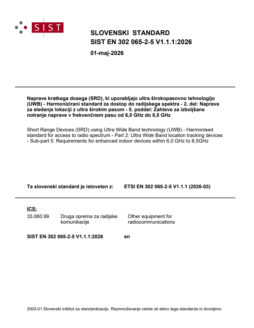 SIST EN 302 065-2-5 V1.1.1:2026 is a standard published by the Slovenian Institute for Standardization (SIST). Its full title is "Short Range Devices (SRD) using Ultra Wide Band technology (UWB) - Harmonised standard for access to radio spectrum - Part 2: Ultra Wide Band location tracking devices - Sub-part 5: Requirements for enhanced indoor devices within 6,0 GHz to 8,5GHz". This standard covers: The present document specifies technical requirements, limits and test methods for transceivers and transmitters utilizing Ultra WideBand (UWB) technologies for location tracking for enhanced indoor devices within 6,0 GHz to 8,5 GHz. NOTE: The relationship between the present document and essential requirements of article 3.2 of Directive 2014/53/EU is given in Annex A.
