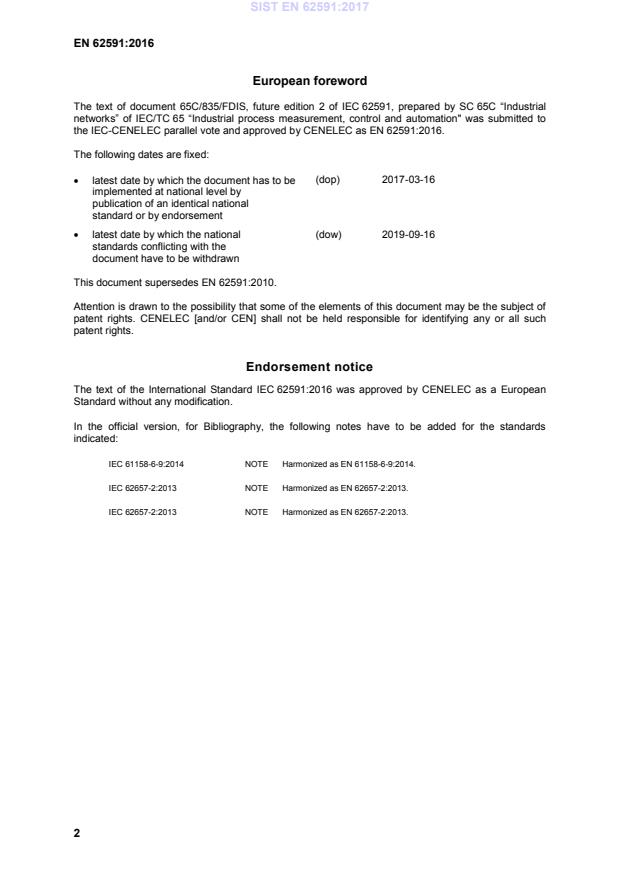 SIST EN 62591:2017 is a standard published by the Slovenian Institute for Standardization (SIST). Its full title is "Industrial communication networks - Wireless communication network and communication profiles - WirelessHART (IEC 62591:2016)". This standard covers: IEC 62591:2016 specifies a wireless communication network in addition to the Type 20 in IEC 61158-3-20, IEC 61158-4-20, IEC 61158-5-20, IEC 61158-6-20 and a Communication Profile CP 9/2 in addition to IEC 61784-1, CPF 9. It specifies the following: - Physical layer service definition and protocol specification, - Data-link layer service and protocol, - Application layer service and protocol, - Network management, - Security, - Communication profile, - Wireless procedures and Gateway. This second edition cancels and replaces the first edition published in 2010. This edition constitutes a technical revision. This edition includes the following significant technical changes with respect to the previous edition: - enhancements to the performance statistics using key performance indicators (KPI); - "Stale Data" detection was added (see services Read stale data setpoints, Write stale data timer and Write stale data count setpoint).; - gateway commands were added; - a Quarantined State was added; - CCA Modes were extended to be more in-line with IEEE 802.15.4; - clarifications on whitelist and blacklist management were added; - clarifications on join (e.g. only require a single neighbor) were added; - clarifications on use of join links, table management, and defaults were added; - corrections and updates were made. The reader's attention is drawn to the fact that Annex M lists all of the "in-some-country" clauses on differing practices of a less permanent nature relating to the subject of this standard.