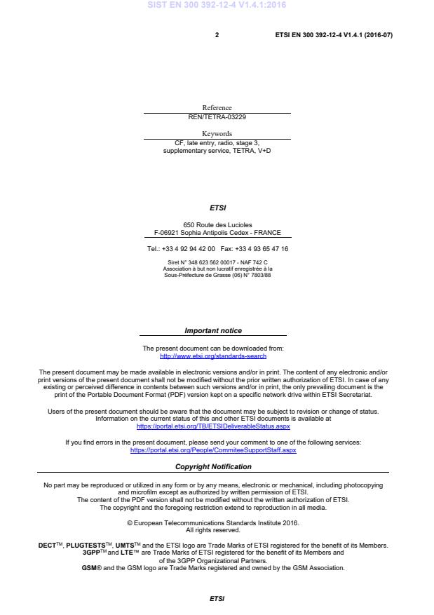 DECTTM, PLUGTESTSTM, UMTSTM and the ETSI logo are Trade Marks of ETSI registered for the benefit of its Members. 3GPPTM and LTE™ are Trade Marks of ETSI registered for the benefit of its Members and of the 3GPP Organizational Partners. GSM® and the GSM logo are Trade Marks registered and owned by the GSM Association. SIST EN 300 392-12-4 V1.4.1:2016