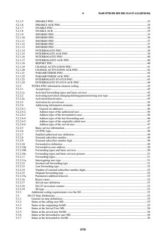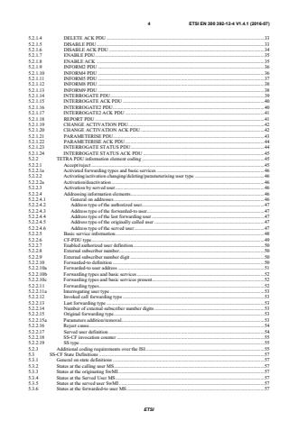 ETSI ETSI EN 300 392-12-4 V1.4.1 (2016-07) 4 5.2.1.4 DELETE ACK PDU . 33 5.2.1.5 DISABLE PDU . 33 5.2.1.6 DISABLE ACK PDU . 34 5.2.1.7 ENABLE PDU . 35 5.2.1.8 ENABLE ACK . 35 5.2.1.9 INFORM2 PDU . 36 5.2.1.10 INFORM4 PDU . 36 5.2.1.11 INFORM5 PDU . 37 5.2.1.12 INFORM8 PDU . 38 5.2.1.13 INFORM9 PDU . 38 5.2.1.14 INTERROGATE PDU . 39 5.2.1.15 INTERROGATE ACK PDU . 40 5.2.1.16 INTERROGATE2 PDU . 40 5.2.1.17 INTERROGATE2 ACK PDU . 41 5.2.1.18 REPORT PDU . 41 5.2.1.19 CHANGE ACTIVATION PDU . 42 5.2.1.20 CHANGE ACTIVATION ACK PDU . 42 5.2.1.21 PARAMETERISE PDU . 43 5.2.1.22 PARAMETERISE ACK PDU . 44 5.2.1.23 INTERROGATE STATUS PDU . 44 5.2.1.24 INTERROGATE STATUS ACK PDU . 45 5.2.2 TETRA PDU information element coding . 45 5.2.2.1 Accept/reject . 45 5.2.2.1a Activated forwarding types and basic services . 46 5.2.2.2 Activating/activation changing/deleting/parameterising user type . 46 5.2.2.2a Activation/deactivation . 46 5.2.2.3 Activation by served user . 46 5.2.2.4 Addressing information elements . 46 5.2.2.4.1 General on addresses . 46 5.2.2.4.2 Address type of the authorized user. 47 5.2.2.4.3 Address type of the forwarded-to user . 47 5.2.2.4.4 Address type of the last forwarding user . 47 5.2.2.4.5 Address type of the originally called user . 47 5.2.2.4.6 Address type of the served user . 47 5.2.2.5 Basic service information . 48 5.2.2.6 CF-PDU type. 49 5.2.2.7 Enabled authorized user definition . 50 5.2.2.8 External subscriber number . 50 5.2.2.9 External subscriber number digit . 50 5.2.2.10 Forwarded-to definition . 50 5.2.2.10a Forwarded-to user address . 51 5.2.2.10b Forwarding types and basic services . 52 5.2.2.10c Forwarding types and basic services present. 52 5.2.2.11 Forwarding types . 52 5.2.2.11a Interrogating user type . 53 5.2.2.12 Invoked call forwarding type . 53 5.2.2.13 Last forwarding type . 53 5.2.2.14 Number of external subscriber number digits . 53 5.2.2.15 Original forwarding type . 53 5.2.2.15a Parameters addition/removal . 53 5.2.2.16 Reject cause. 54 5.2.2.17 Served user definition . 54 5.2.2.18 SS-CF invocation counter . 55 5.2.2.19 SS type . 55 5.2.3 Additional coding requirements over the ISI . 55 5.3 SS-CF State Definitions . 57 5.3.1 General on state definitions . 57 5.3.2 States at the calling user MS . 57 5.3.3 States at the originating SwMI . 57 5.3.4 States at the Served User MS . 57 5.3.5 States at the served user SwMI . 57 5.3.6 States at the forwarded-to user MS . 57 SIST EN 300 392-12-4 V1.4.1:2016