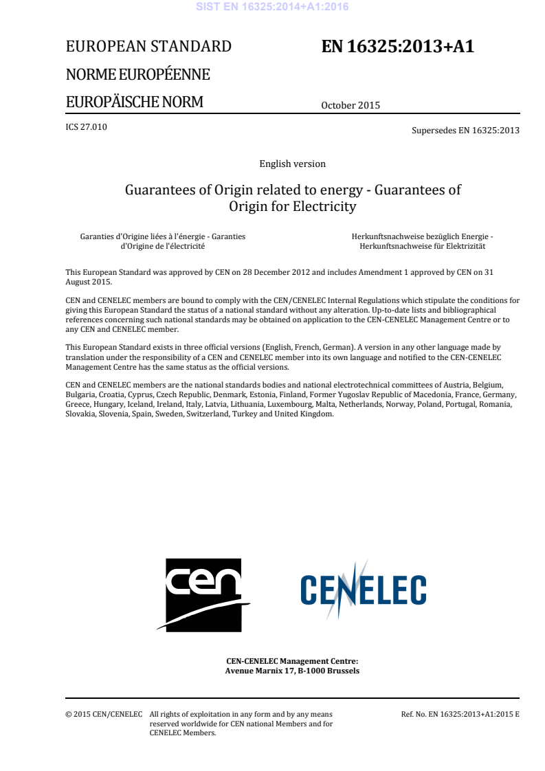 SIST EN 16325:2014+A1:2016 is a standard published by the Slovenian Institute for Standardization (SIST). Its full title is "Guarantees of Origin related to energy - Guarantees of Origin for Electricity". This standard covers: This European Standard specifies requirements for Guarantees of Origin of Electricity from all energy sources. This standard will establish the relevant terminology and definitions, requirements for registration, issuing, transferring and cancellation in line with the RES, Energy Efficiency and IEM Directives. This standard will also cover measuring methods and auditing procedures. These Guarantees of Origin may be traded and/or used for Disclosure/Labelling. The content of this standard can, for example, be applied, after necessary modifications, to heating, cooling, and gas (including biogas). These modifications are not part of this standard. This European Standard will not establish any sustainability criteria, this work is done elsewhere. This standard is suitable for certification purposes.