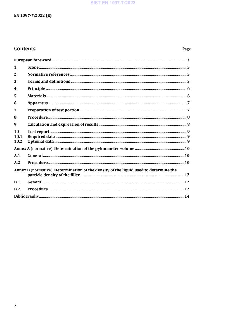 Annex A specifies the procedure for determination of the pyknometer volume. Annex B specifies the procedure for determination of the density of the liquid used to determine the particle density of the filler. Annexes A and B are normative.