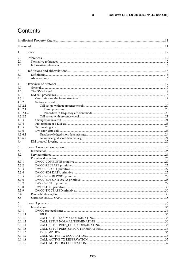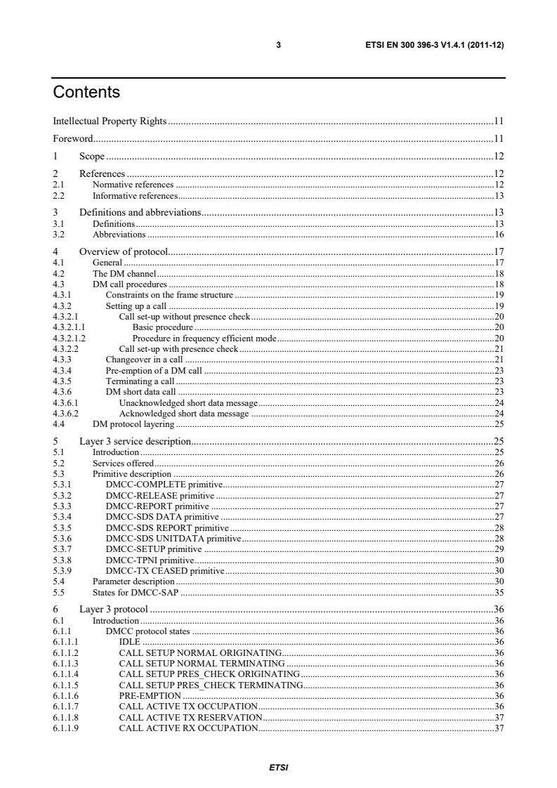 ETSI ETSI EN 300 396-3 V1.4.1 (2011-12) 3 Contents Intellectual Property Rights . 11 Foreword . 11 1 Scope . 12 2 References . 12 2.1 Normative references . 12 2.2 Informative references . 13 3 Definitions and abbreviations . 13 3.1 Definitions . 13 3.2 Abbreviations . 16 4 Overview of protocol. 17 4.1 General . 17 4.2 The DM channel . 18 4.3 DM call procedures . 18 4.3.1 Constraints on the frame structure . 19 4.3.2 Setting up a call . 19 4.3.2.1 Call set-up without presence check . 20 4.3.2.1.1 Basic procedure . 20 4.3.2.1.2 Procedure in frequency efficient mode . 20 4.3.2.2 Call set-up with presence check . 21 4.3.3 Changeover in a call . 21 4.3.4 Pre-emption of a DM call . 23 4.3.5 Terminating a call . 23 4.3.6 DM short data call . 23 4.3.6.1 Unacknowledged short data message . 24 4.3.6.2 Acknowledged short data message . 24 4.4 DM protocol layering . 25 5 Layer 3 service description . 25 5.1 Introduction . 25 5.2 Services offered . 26 5.3 Primitive description . 26 5.3.1 DMCC-COMPLETE primitive . 27 5.3.2 DMCC-RELEASE primitive . 27 5.3.3 DMCC-REPORT primitive . 27 5.3.4 DMCC-SDS DATA primitive . 27 5.3.5 DMCC-SDS REPORT primitive . 28 5.3.6 DMCC-SDS UNITDATA primitive . 28 5.3.7 DMCC-SETUP primitive . 29 5.3.8 DMCC-TPNI primitive . 30 5.3.9 DMCC-TX CEASED primitive . 30 5.4 Parameter description . 30 5.5 States for DMCC-SAP . 35 6 Layer 3 protocol . 36 6.1 Introduction . 36 6.1.1 DMCC protocol states . 36 6.1.1.1 IDLE . 36 6.1.1.2 CALL SETUP NORMAL ORIGINATING . 36 6.1.1.3 CALL SETUP NORMAL TERMINATING . 36 6.1.1.4 CALL SETUP PRES_CHECK ORIGINATING . 36 6.1.1.5 CALL SETUP PRES_CHECK TERMINATING. 36 6.1.1.6 PRE-EMPTION . 36 6.1.1.7 CALL ACTIVE TX OCCUPATION . 36 6.1.1.8 CALL ACTIVE TX RESERVATION . 37 6.1.1.9 CALL ACTIVE RX OCCUPATION. 37 SIST EN 300 396-3 V1.4.1:2012