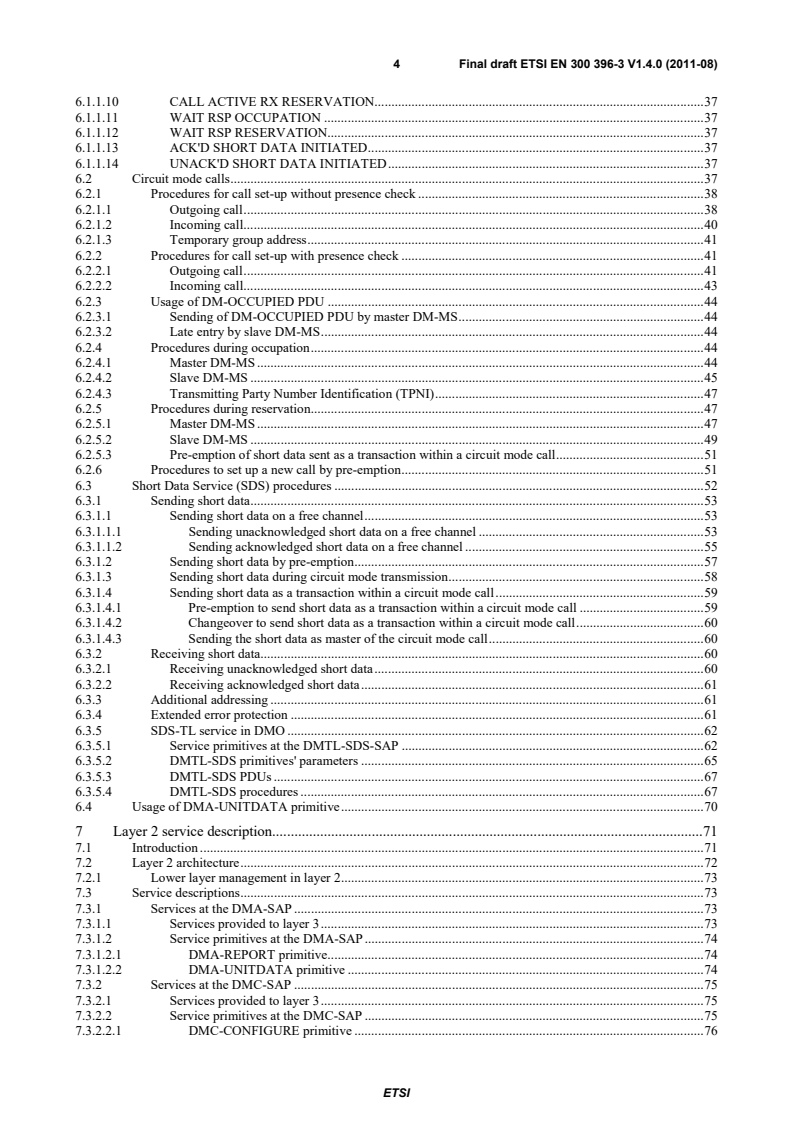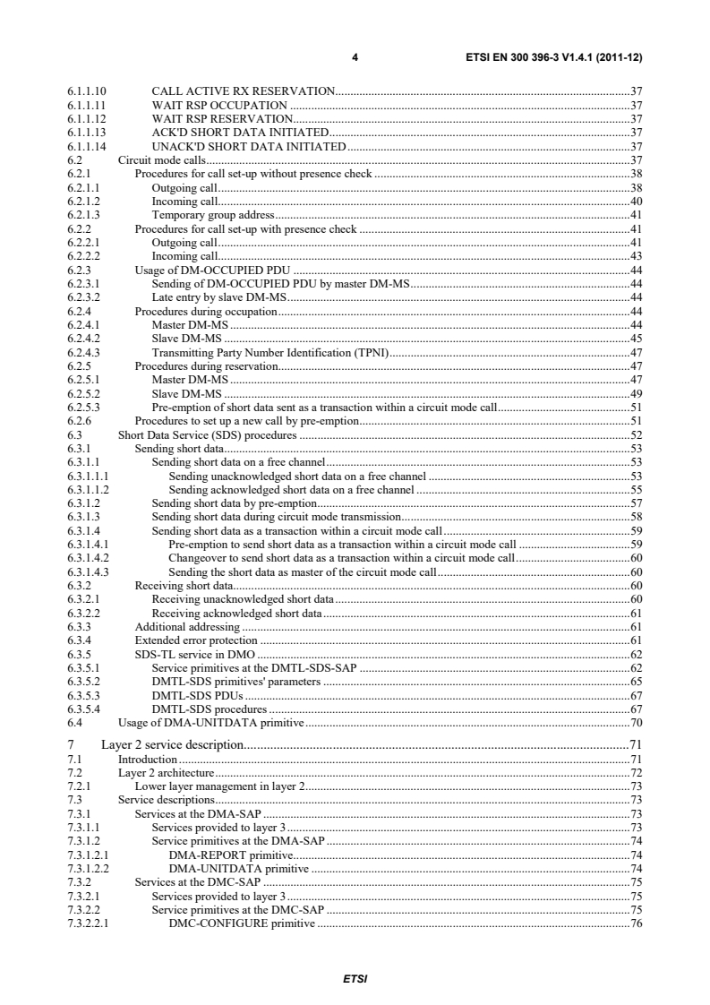 ETSI ETSI EN 300 396-3 V1.4.1 (2011-12) 4 6.1.1.10 CALL ACTIVE RX RESERVATION. 37 6.1.1.11 WAIT RSP OCCUPATION . 37 6.1.1.12 WAIT RSP RESERVATION. 37 6.1.1.13 ACK'D SHORT DATA INITIATED . 37 6.1.1.14 UNACK'D SHORT DATA INITIATED . 37 6.2 Circuit mode calls . 37 6.2.1 Procedures for call set-up without presence check . 38 6.2.1.1 Outgoing call . 38 6.2.1.2 Incoming call. 40 6.2.1.3 Temporary group address . 41 6.2.2 Procedures for call set-up with presence check . 41 6.2.2.1 Outgoing call . 41 6.2.2.2 Incoming call. 43 6.2.3 Usage of DM-OCCUPIED PDU . 44 6.2.3.1 Sending of DM-OCCUPIED PDU by master DM-MS . 44 6.2.3.2 Late entry by slave DM-MS . 44 6.2.4 Procedures during occupation . 44 6.2.4.1 Master DM-MS . 44 6.2.4.2 Slave DM-MS . 45 6.2.4.3 Transmitting Party Number Identification (TPNI) . 47 6.2.5 Procedures during reservation. 47 6.2.5.1 Master DM-MS . 47 6.2.5.2 Slave DM-MS . 49 6.2.5.3 Pre-emption of short data sent as a transaction within a circuit mode call . 51 6.2.6 Procedures to set up a new call by pre-emption . 51 6.3 Short Data Service (SDS) procedures . 52 6.3.1 Sending short data . 53 6.3.1.1 Sending short data on a free channel . 53 6.3.1.1.1 Sending unacknowledged short data on a free channel . 53 6.3.1.1.2 Sending acknowledged short data on a free channel . 55 6.3.1.2 Sending short data by pre-emption . 57 6.3.1.3 Sending short data during circuit mode transmission . 58 6.3.1.4 Sending short data as a transaction within a circuit mode call . 59 6.3.1.4.1 Pre-emption to send short data as a transaction within a circuit mode call . 59 6.3.1.4.2 Changeover to send short data as a transaction within a circuit mode call . 60 6.3.1.4.3 Sending the short data as master of the circuit mode call . 60 6.3.2 Receiving short data. 60 6.3.2.1 Receiving unacknowledged short data . 60 6.3.2.2 Receiving acknowledged short data . 61 6.3.3 Additional addressing . 61 6.3.4 Extended error protection . 61 6.3.5 SDS-TL service in DMO . 62 6.3.5.1 Service primitives at the DMTL-SDS-SAP . 62 6.3.5.2 DMTL-SDS primitives' parameters . 65 6.3.5.3 DMTL-SDS PDUs . 67 6.3.5.4 DMTL-SDS procedures . 67 6.4 Usage of DMA-UNITDATA primitive . 70 7 Layer 2 service description . 71 7.1 Introduction . 71 7.2 Layer 2 architecture . 72 7.2.1 Lower layer management in layer 2 . 73 7.3 Service descriptions . 73 7.3.1 Services at the DMA-SAP . 73 7.3.1.1 Services provided to layer 3 . 73 7.3.1.2 Service primitives at the DMA-SAP . 74 7.3.1.2.1 DMA-REPORT primitive. 74 7.3.1.2.2 DMA-UNITDATA primitive . 74 7.3.2 Services at the DMC-SAP . 75 7.3.2.1 Services provided to layer 3 . 75 7.3.2.2 Service primitives at the DMC-SAP . 75 7.3.2.2.1 DMC-CONFIGURE primitive . 76 SIST EN 300 396-3 V1.4.1:2012