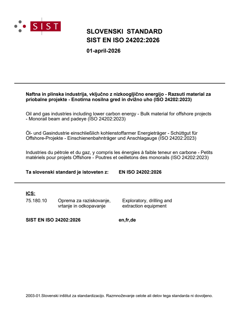 SIST EN ISO 24202:2026 is a standard published by the Slovenian Institute for Standardization (SIST). Its full title is "Oil and gas industries including lower carbon energy - Bulk material for offshore projects - Monorail beam and padeye (ISO 24202:2023)". This standard covers: The purpose of this document is to provide a uniform standard for monorail beams and padeyes when these structures are designed and constructed in offshore projects. This document specifies the design and material requirements for mechanical handling including monorail beams and padeyes during operations of offshore facilities. This document specifies the standard shapes and dimensions of monorail beams and padeyes and provides material requirements for these bulk materials. This document is applicable to the structures of monorail beams and padeyes for topside systems for fixed or floating offshore projects.