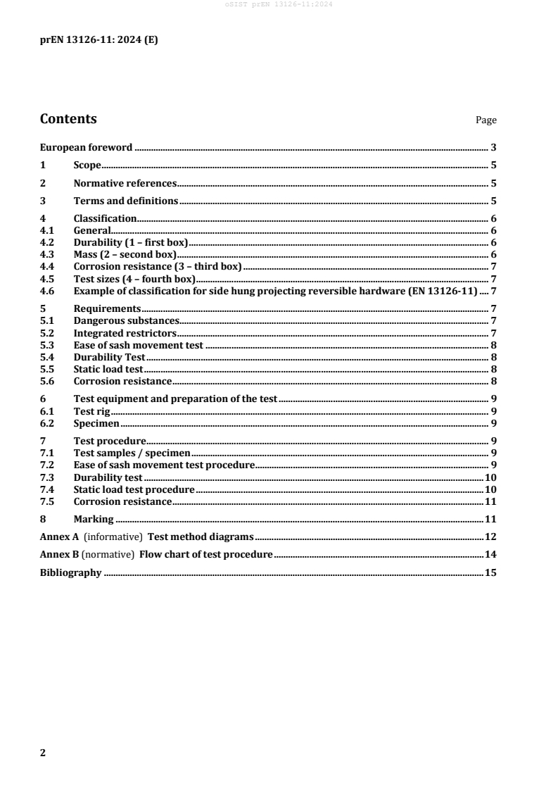 Keywords: EN 13126-11:2025, top hung projecting reversible hardware, window hardware, durability test, corrosion resistance, static load test, EN 1670, EN 13126 series, sash mass, test sizes.
