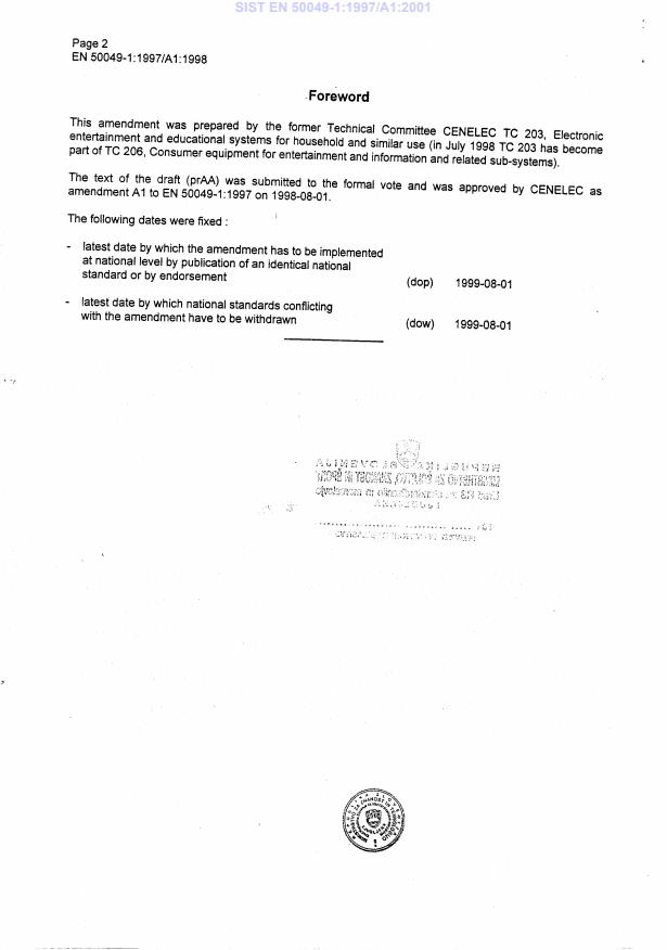 SIST EN 50049-1:1997/A1:2001 is a amendment published by the Slovenian Institute for Standardization (SIST). Its full title is "Domestic and similar electronic equipment interconnection requirements: Peritelevision connector". This standard covers: Initially handled by TC 206 (disbanded) * D141/C101: Transferred to new TC 100X 2021: CLC legacy converted by DCLab NISOSTS
